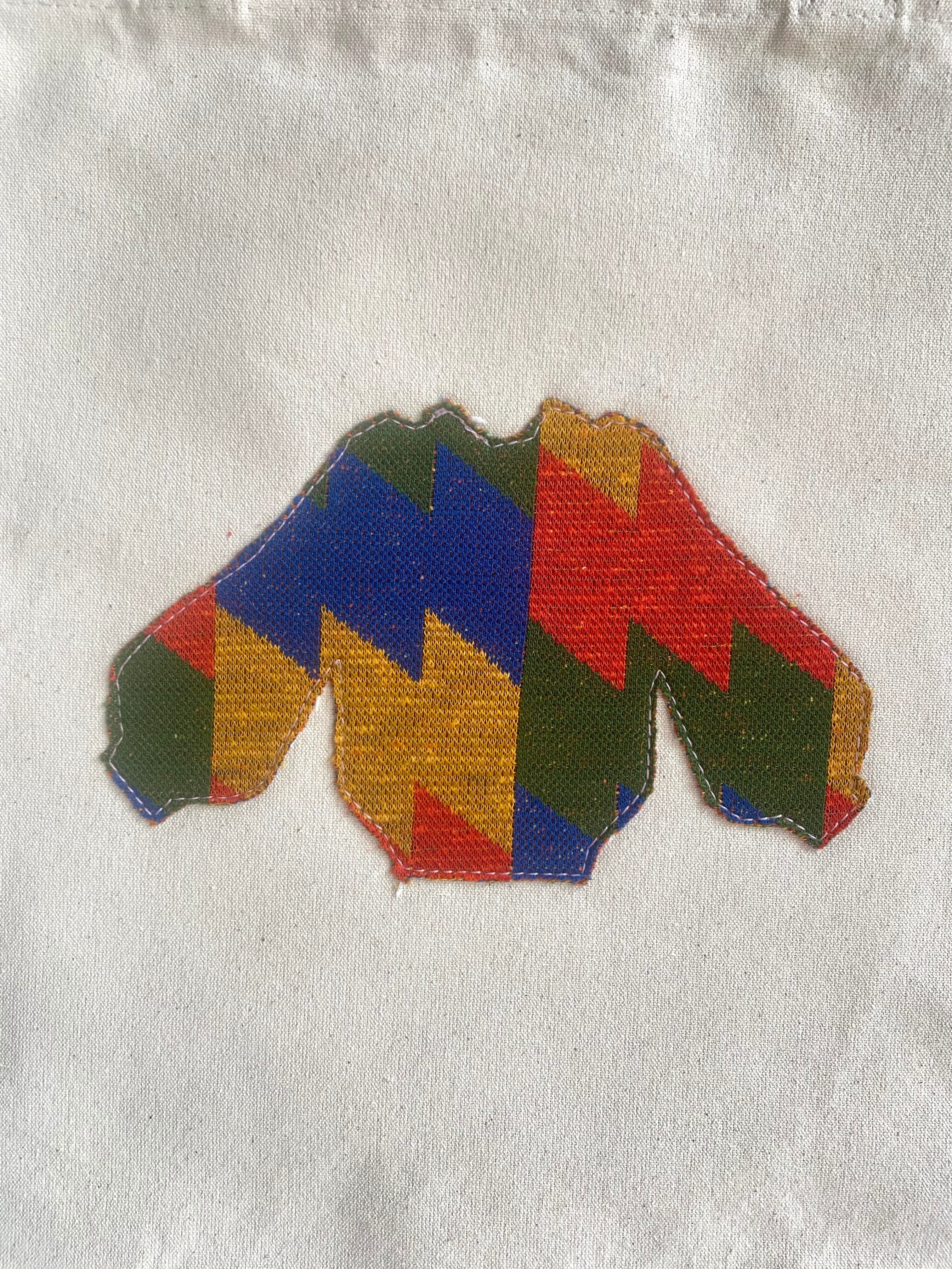 既成の生成りのトートにヴィンテージの様々なファブリックを組み合わせたドローイングシリーズのトートバッグ。