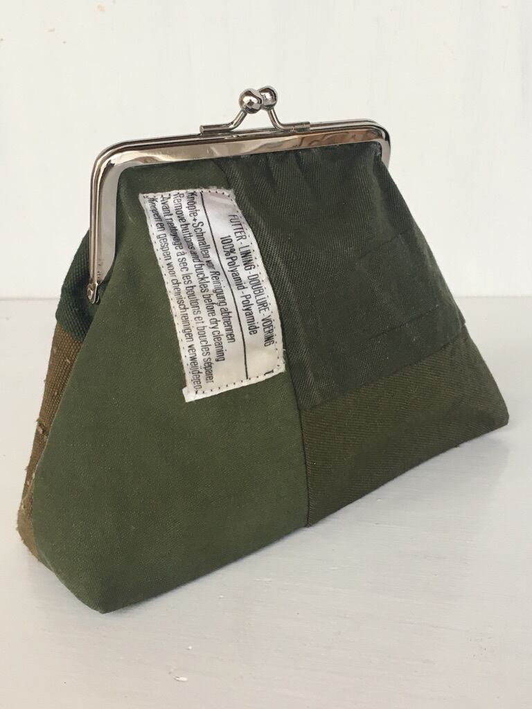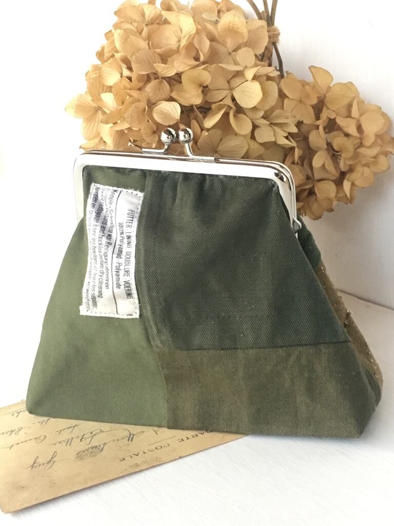 数種類のヴィンテージミリタリーウェアを解体し、ファブリック状にしたものをパッチワークし作成したがま口ポーチです。