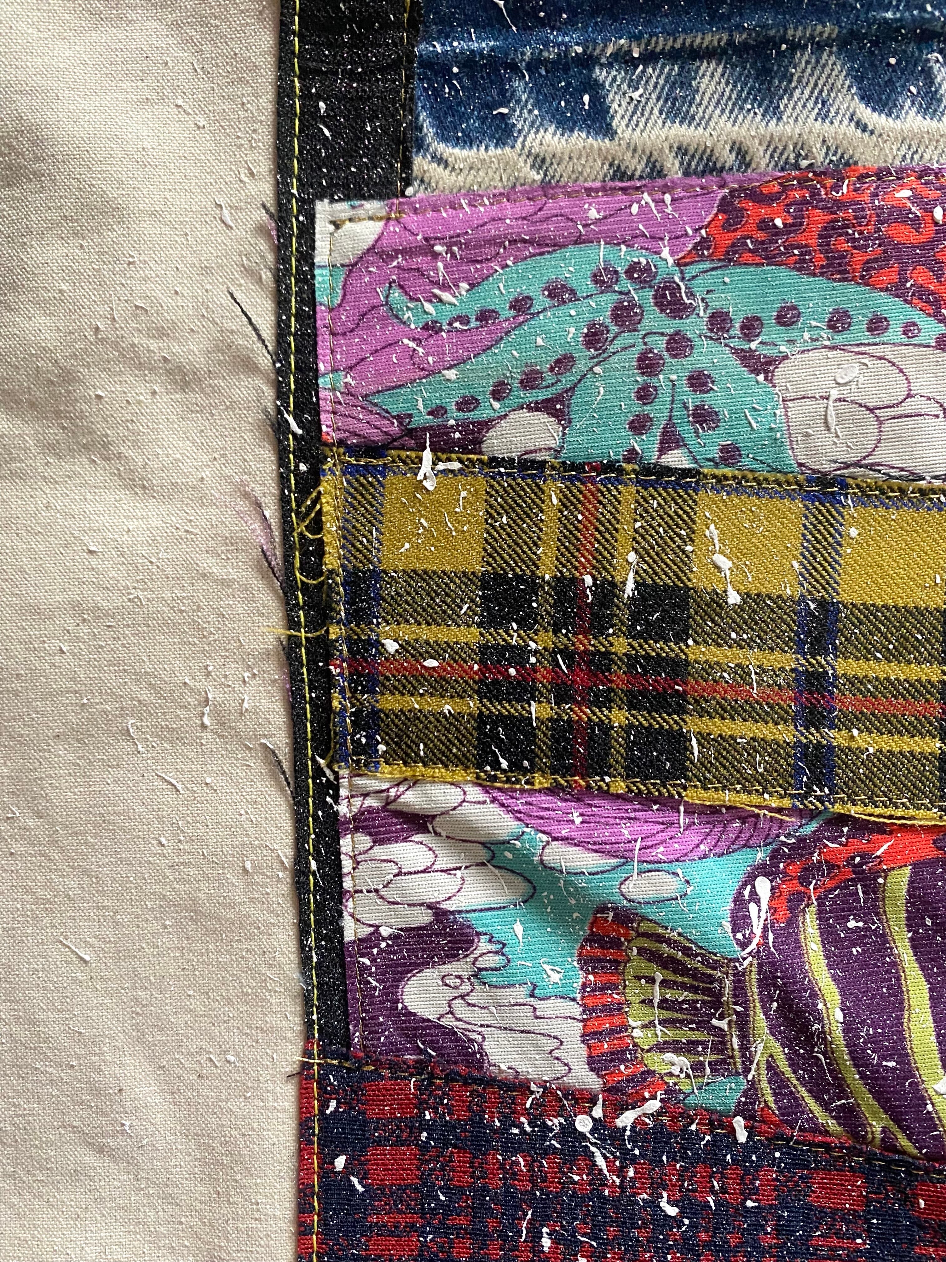 既成の生成りのトートにヴィンテージの様々なファブリックを組み合わせ塗料を吹き付けたアブストラクトなトートバッグ。