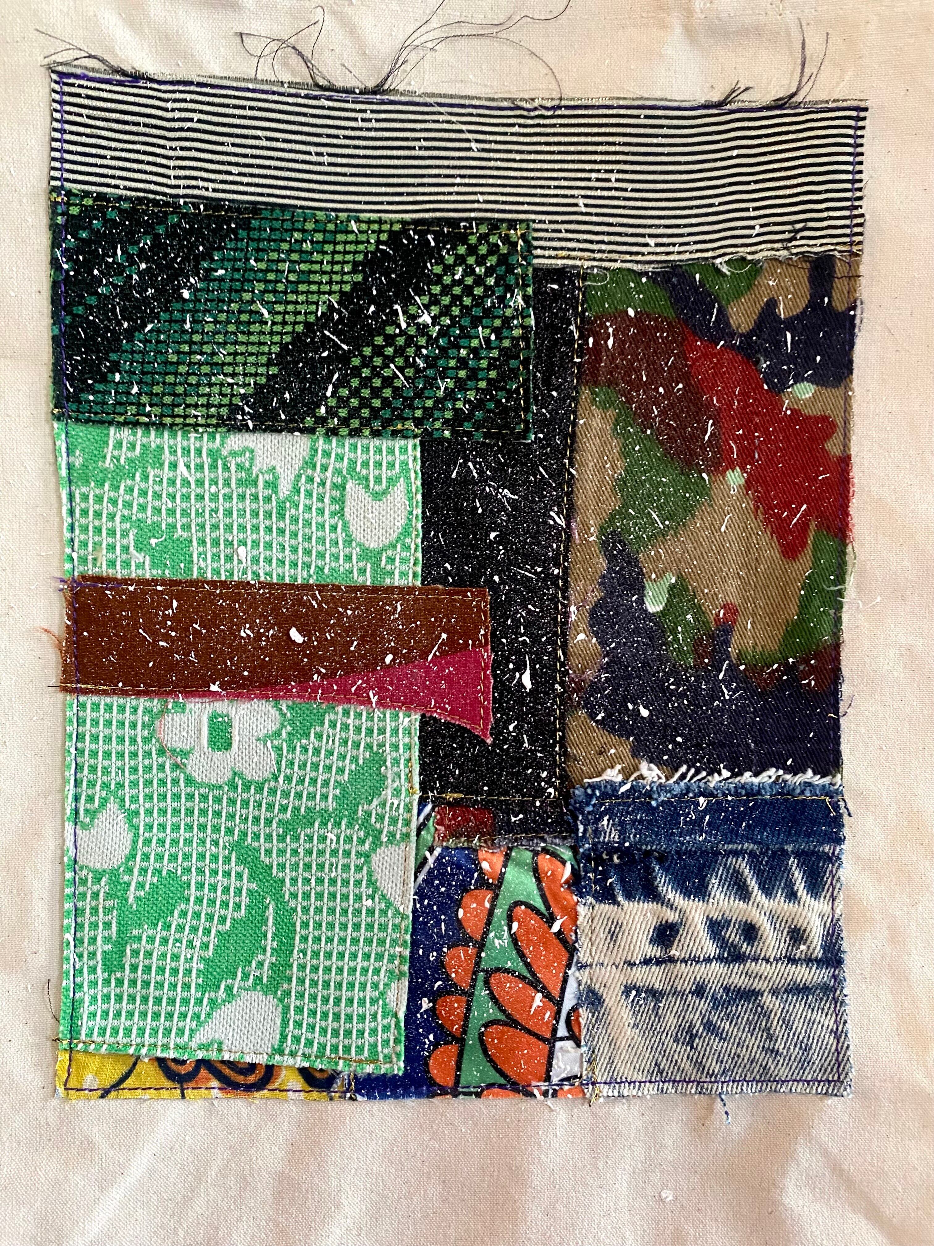 既成の生成りのトートにヴィンテージの様々なファブリックを組み合わせ塗料を吹き付けたアブストラクトなトートバッグ。