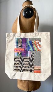 既成の生成りのトートにヴィンテージの様々なファブリックを組み合わせ塗料を吹き付けたアブストラクトなトートバッグ。