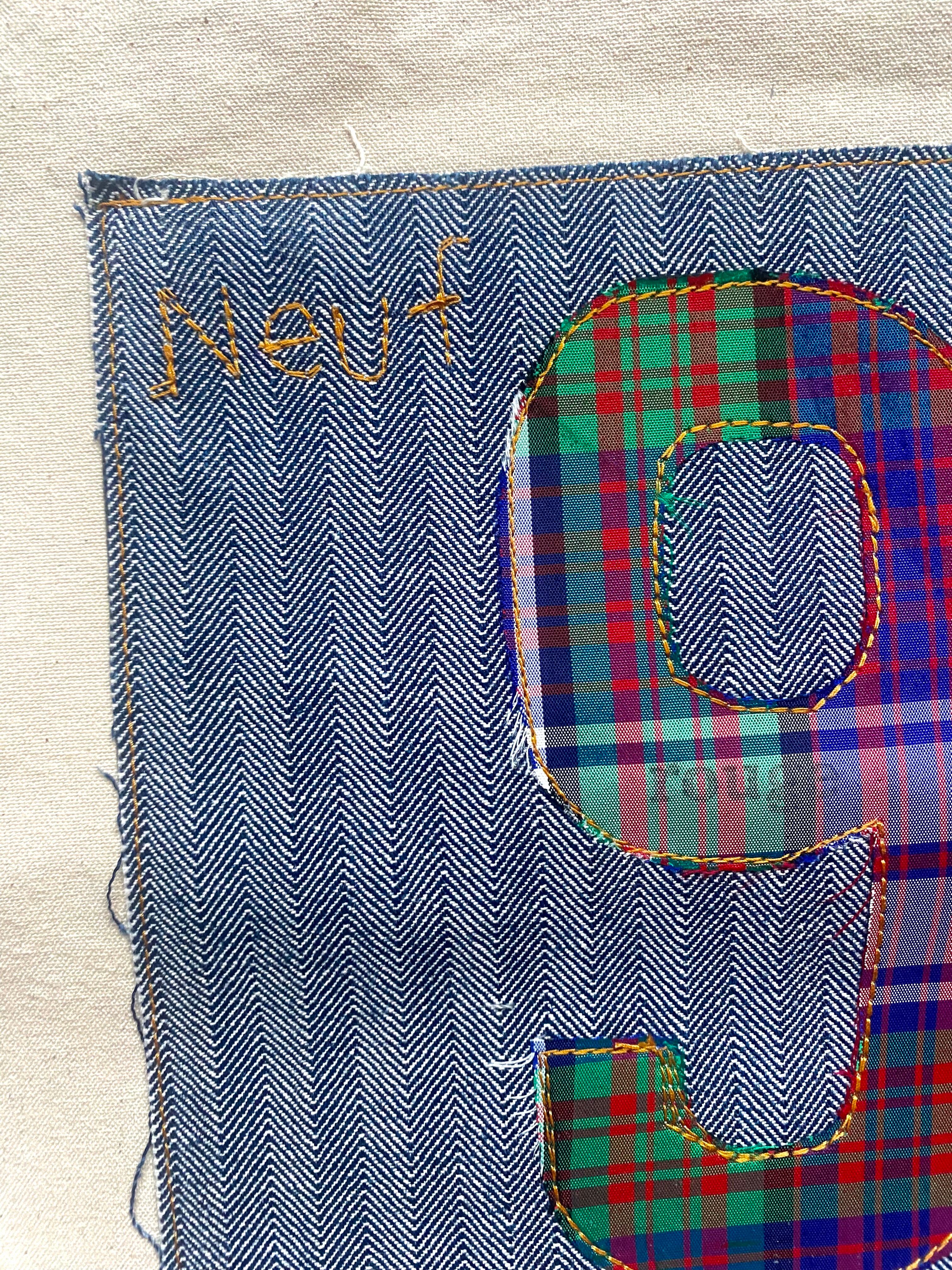 既成の生成りのトートにヴィンテージの様々なファブリックを組み合わせ塗料を吹き付けたアブストラクトなトートバッグ。