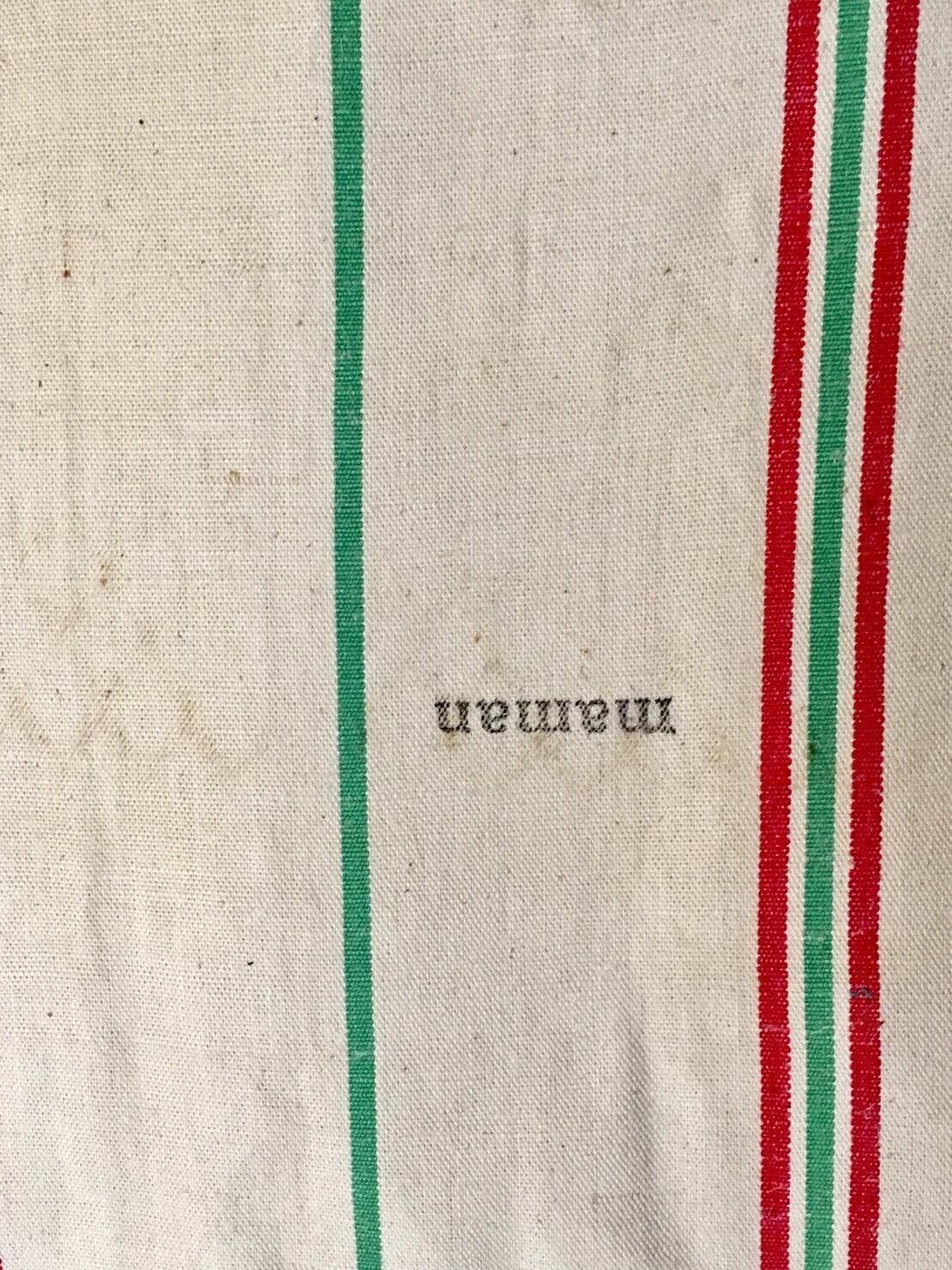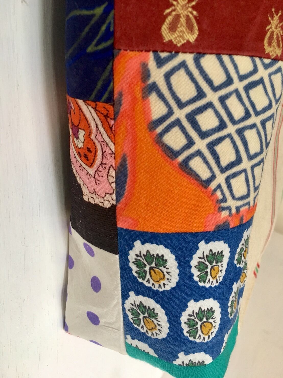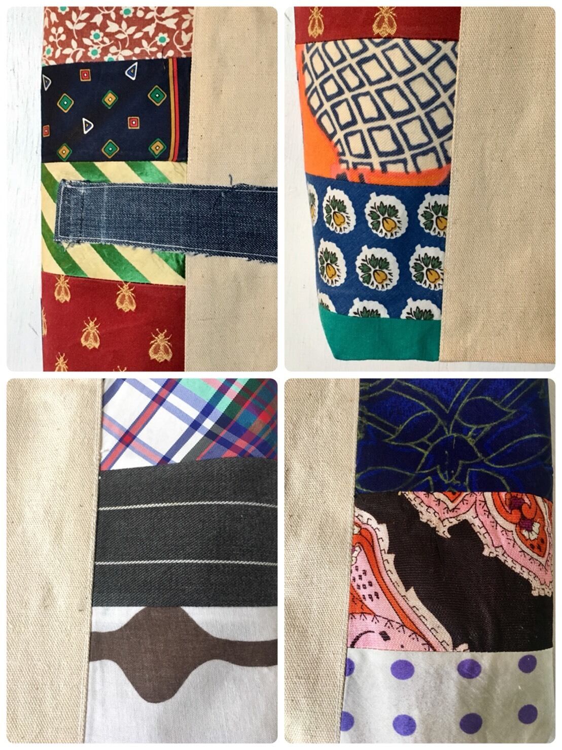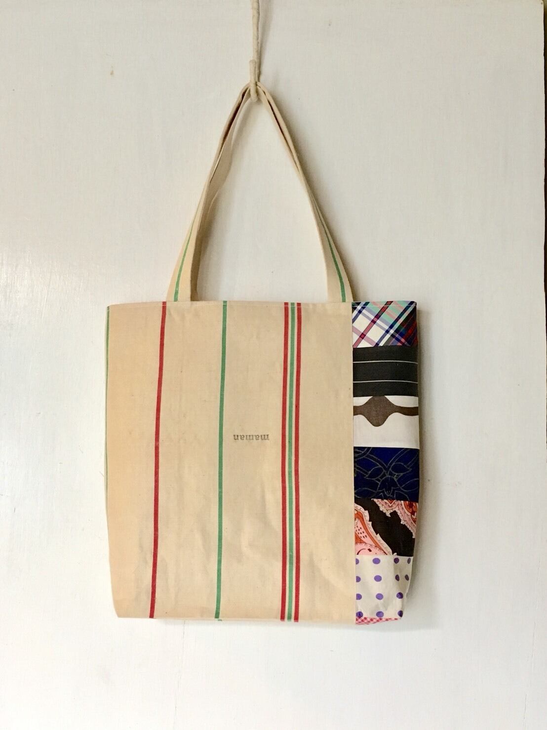 ベースの生地はプレーンな生成りに赤と緑のストライプ。肌触りの良いキャンバスに様々なビンテージの可憐な柄をパッチワークしたものとの組み合わせが清々しい。