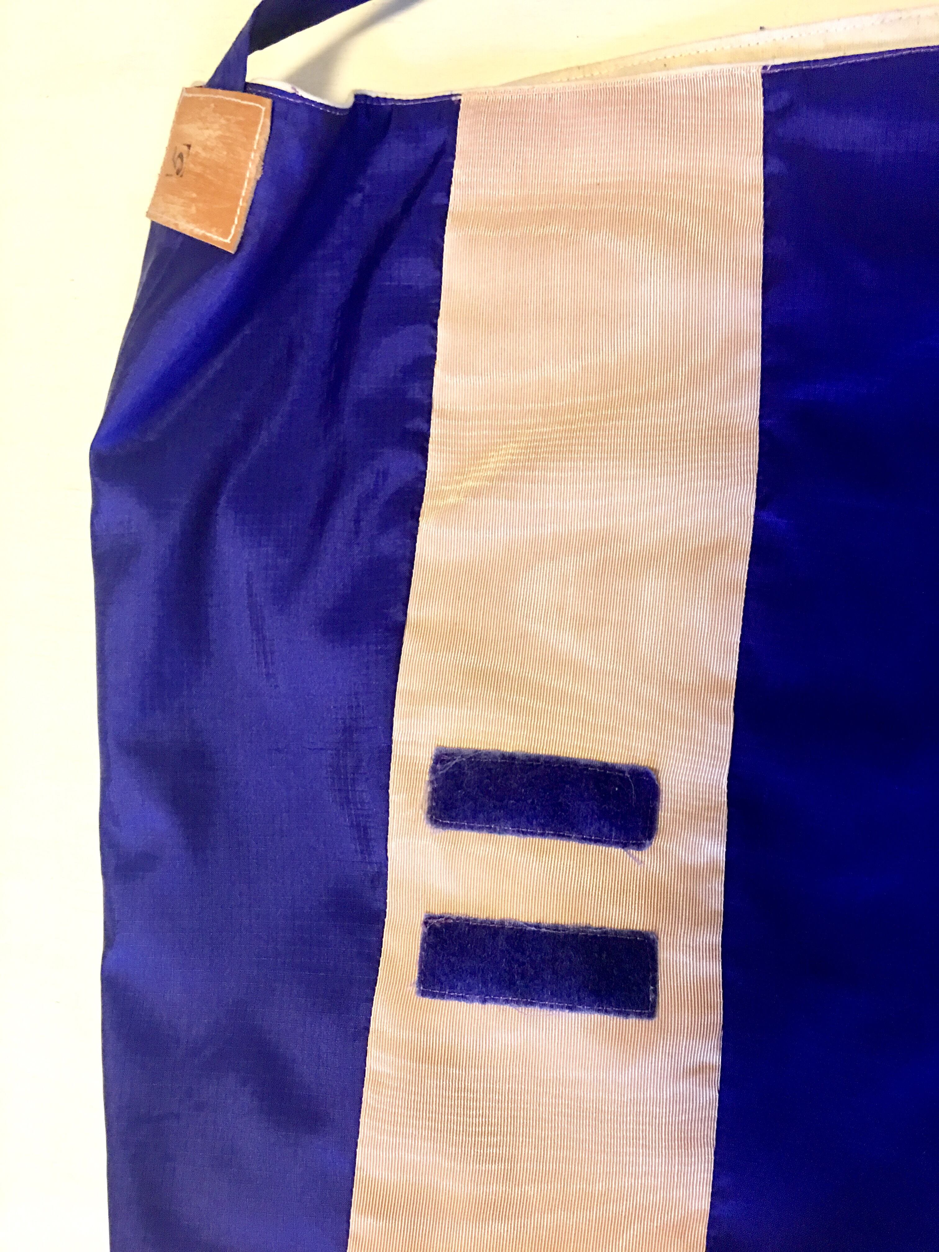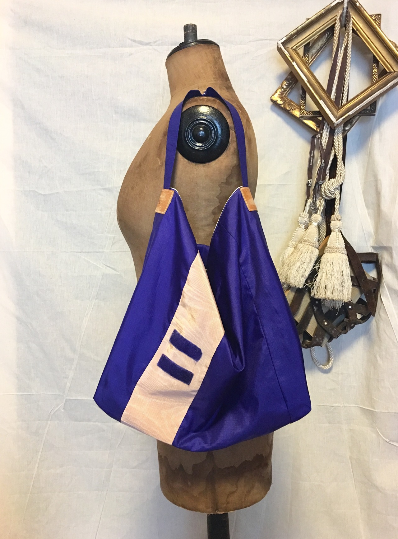 ベースの生地は所謂スポーツウエアであるところのパープル系のリップストップナイロン。ミリタリーものとは違いしなやかで入れる荷物や持ち方によってシルエットが変わるサックダイブとなります。切り替えにはペールピンクのモアレ生地。