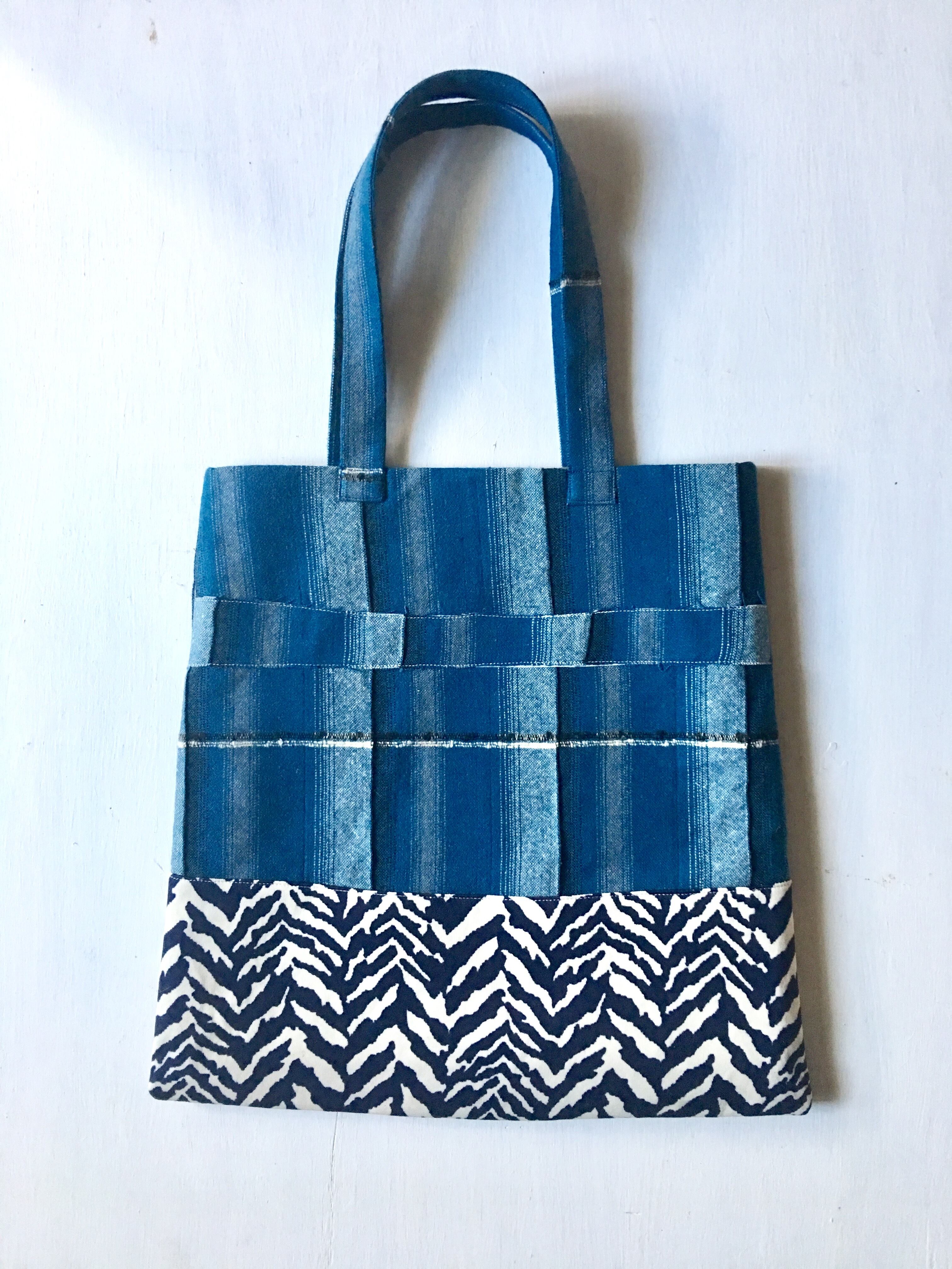 カラーが気分です。切り替えのゼブラ柄も白地にネイビーのプリントでアニマル柄というより葉っぱの葉脈のようにも見える不思議な雰囲気のオールビンテージ素材。あともう一つ。のトートをお探しの方には最適な雰囲気です。形は緩やかな台形型となります。