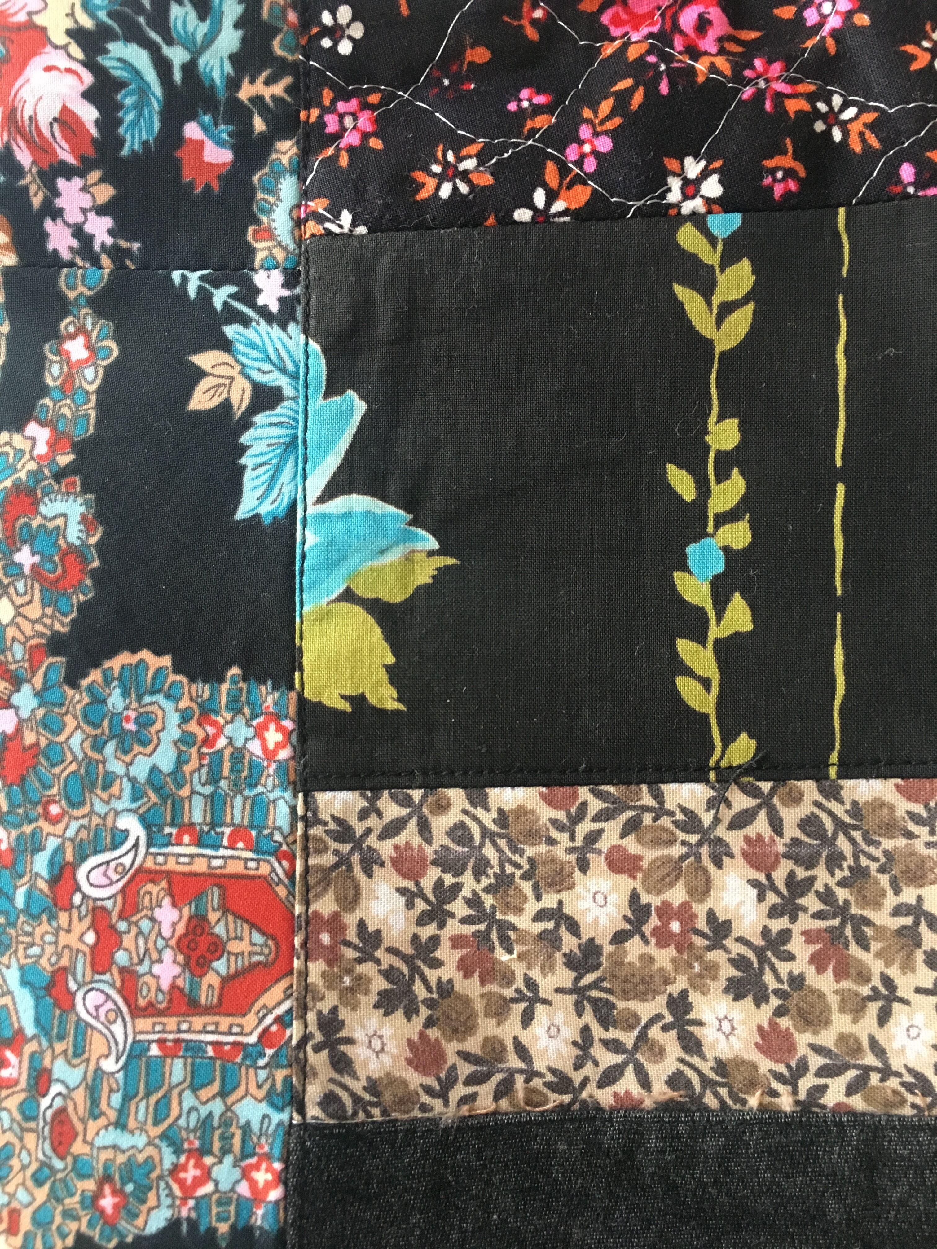 ベースとなるフラノは良い渋みのあるチャコール系で肉厚も中肉程度のもので至極軽量で肩がけして疲れることはありません。相対するフラワープリントの生地達はうるさめ、ロマンチックなもので構成してます。