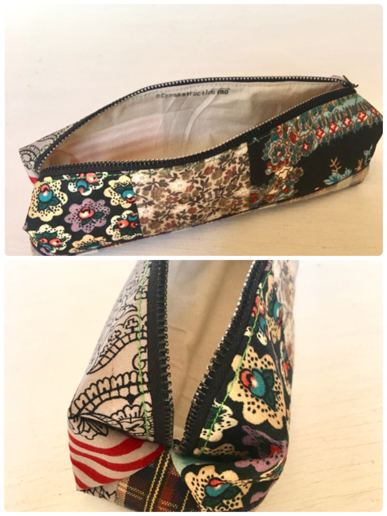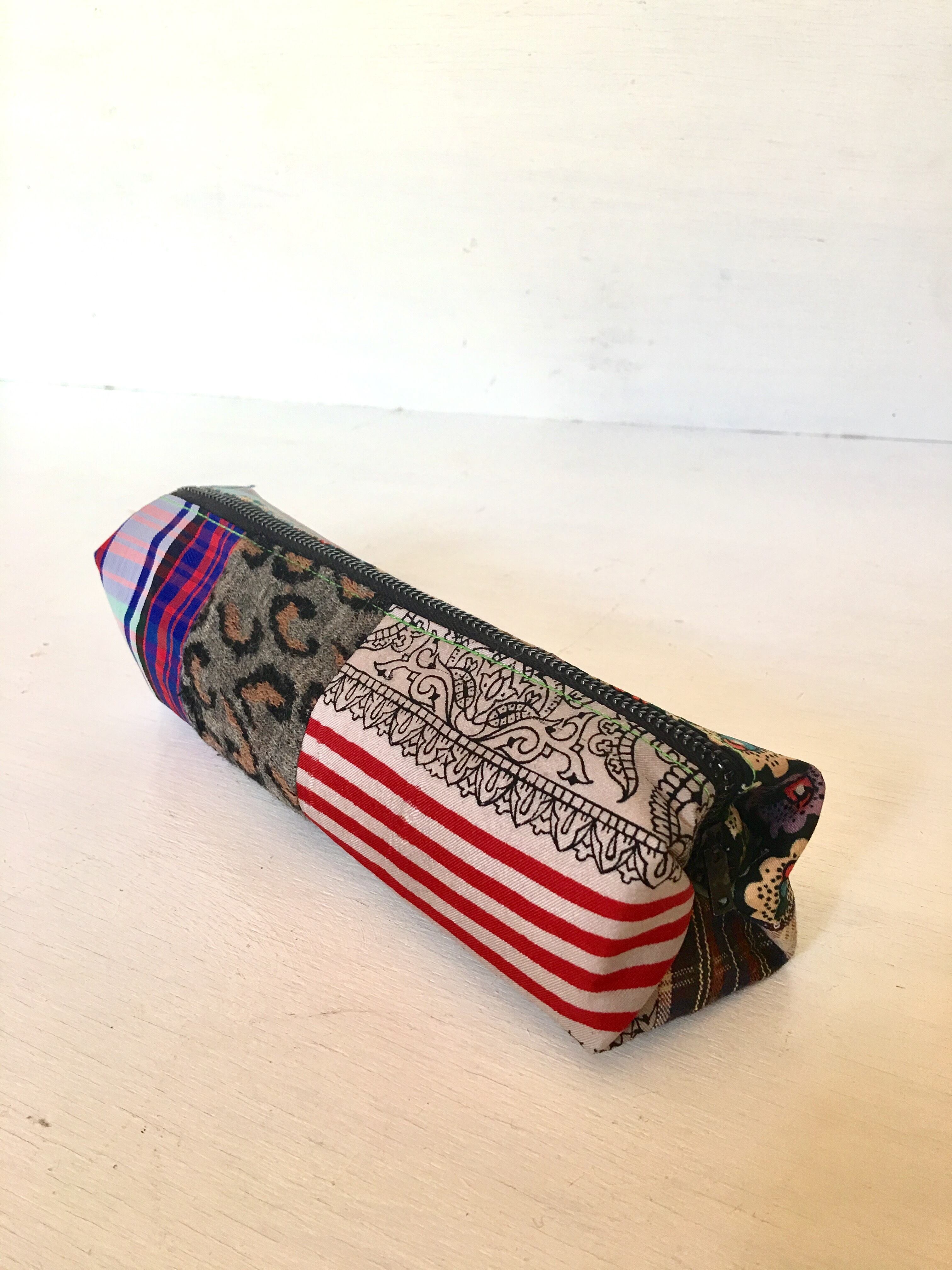 様々なヴィンテージの美しいテキスタイルをパッチワークしたバニティポーチ。