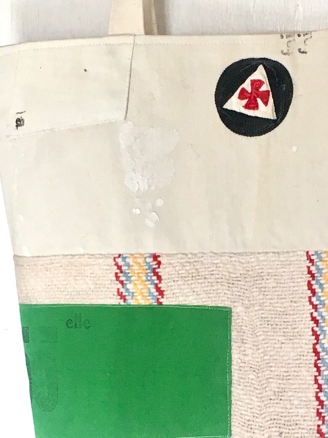 ヴィンテージウェアを解体し布状にしたものよりヘリンボーンオートミール色とチェコ軍キッチンクロスで形成した春色のトートバッグです。