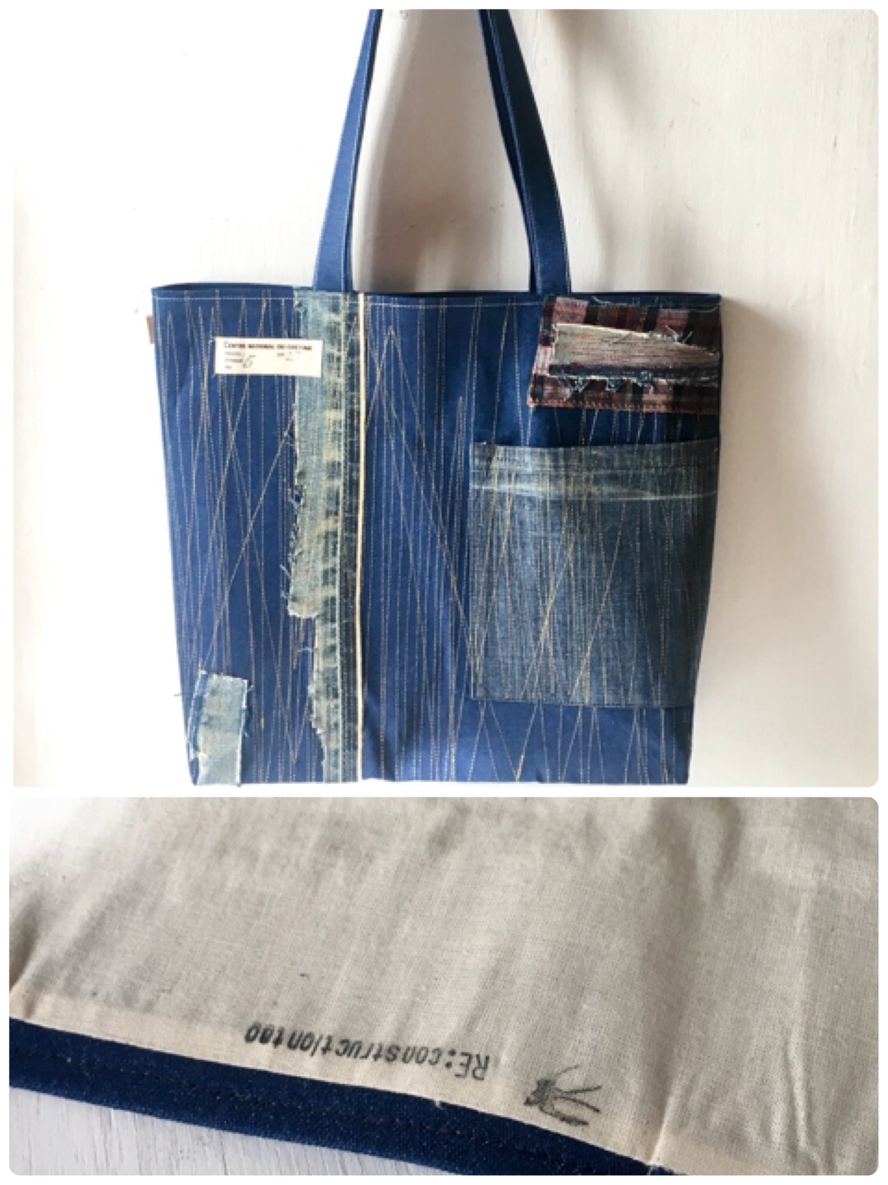 ヴィンテージのデニムを解体し布状にしたものに金糸のランダムステッチを施したもので形成したトートバッグです。