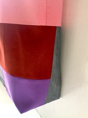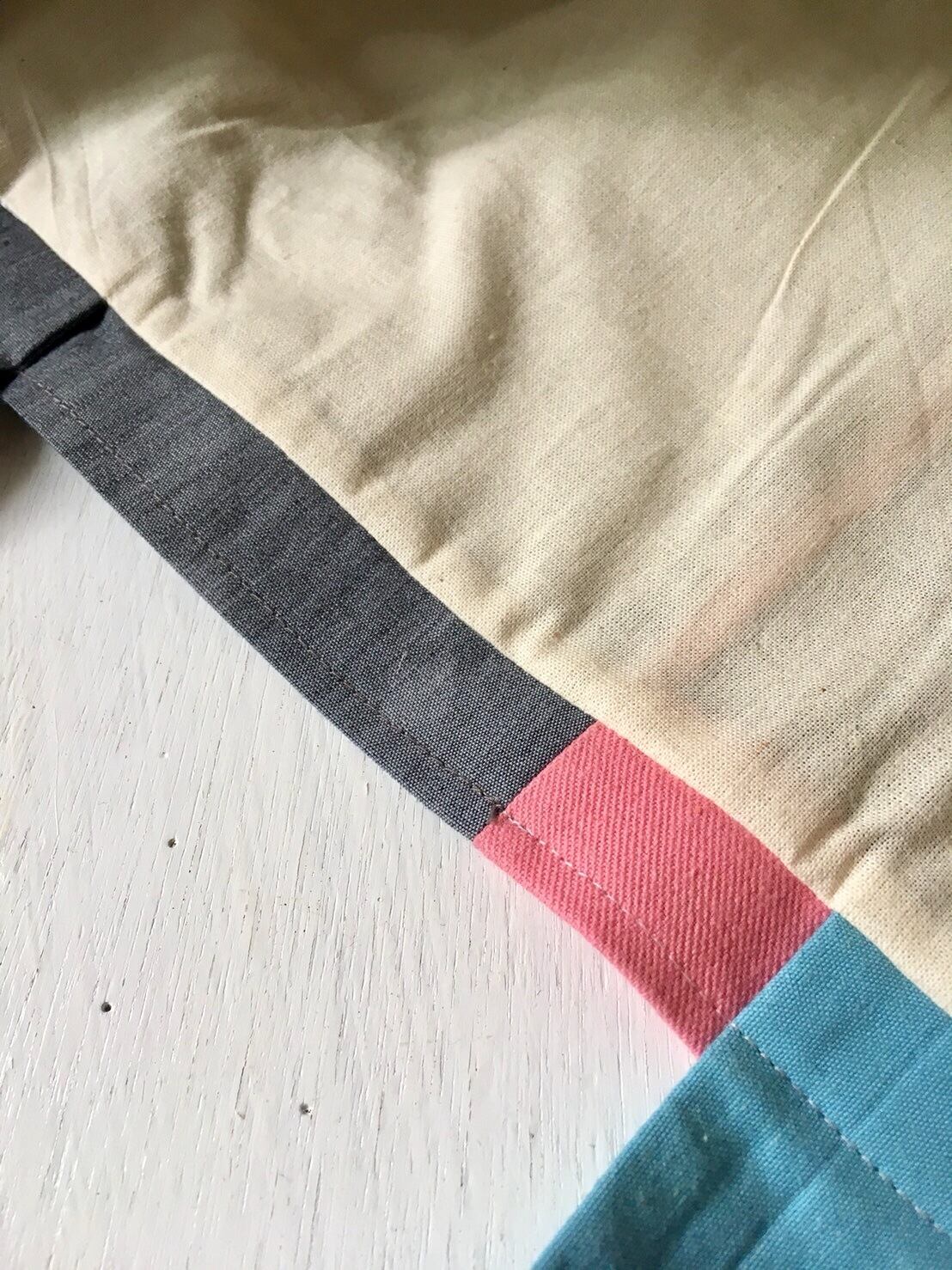 ベースとなる生地は色味のみに趣きを起きブラウスやパンツの裾部分から採取し色味のバランスを絶妙に仕上げています。接着芯を貼っていますのでクタクタしたというより張りがあり比較的カッチリしたバッグ。爽やかなデザイン。