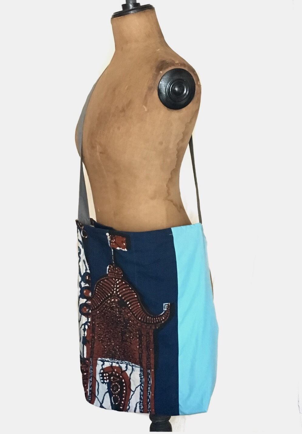 ヴィンテージの連続した柄が美しいアフリカンバティック生地をベースにパッチワークし無地のブロード生地と組み合わせたショルダーバッグです。