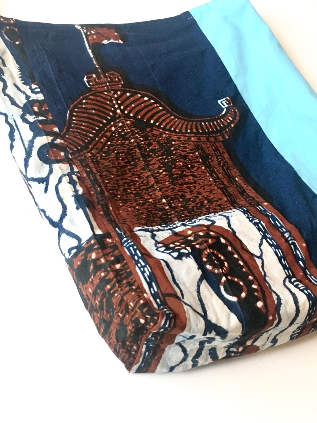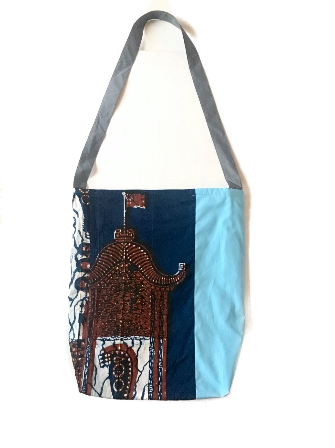 ベースとなるアフリカンバティック生地の鮮やかな色目と保護色にならないカラーのブロード生地は元々はブラウスの袖部分。その名残を残した軽いバッグ。接着芯を全く使用せず、且つ製品洗いを施しています。爽やかなデザイン。