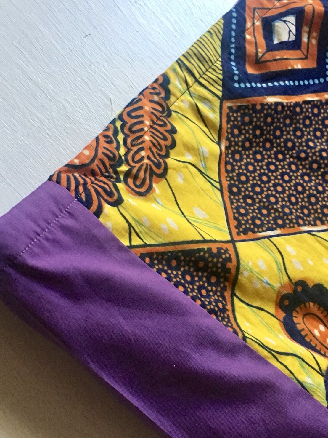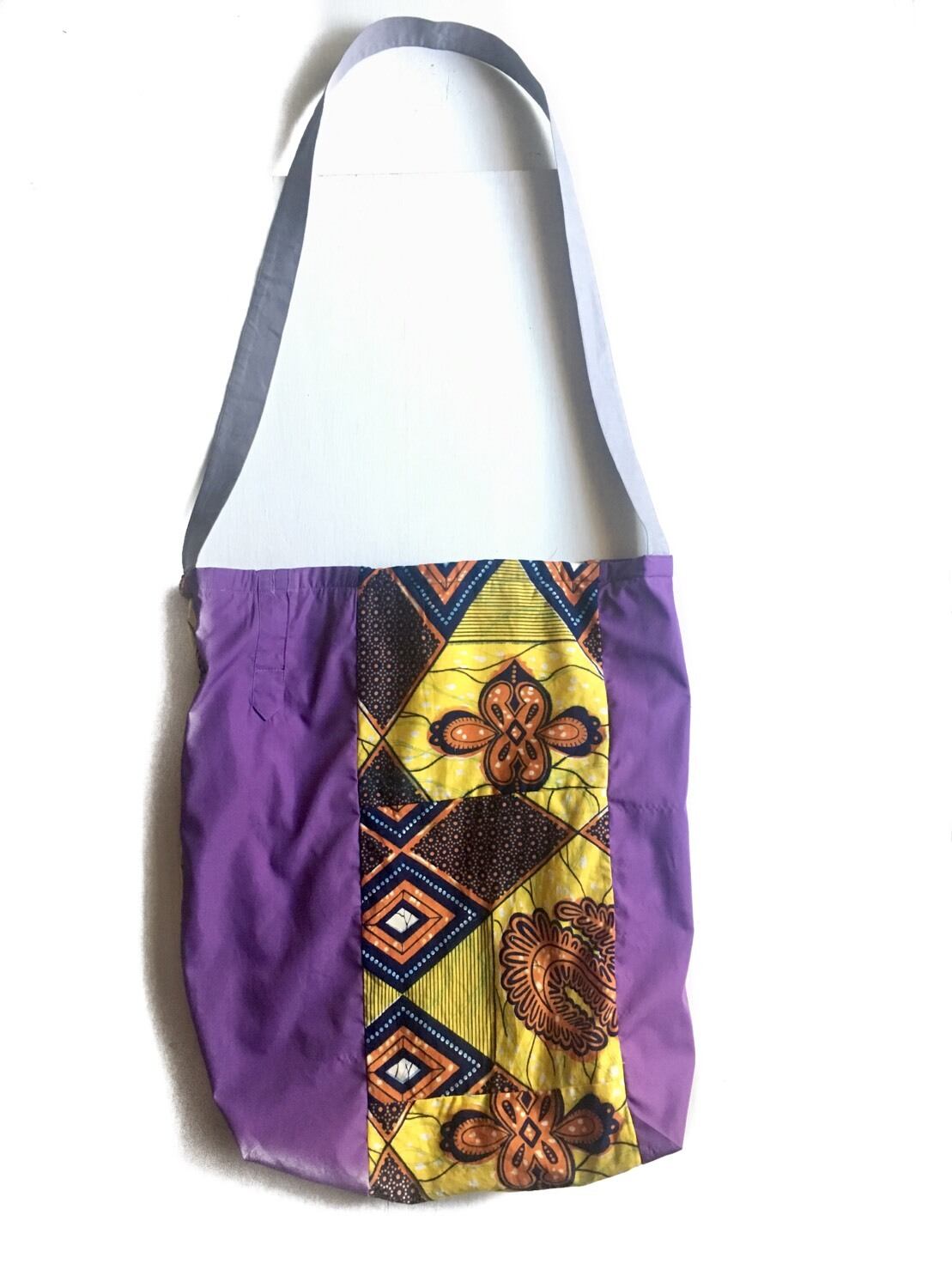 ベースとなるアフリカンバティック生地の鮮やかな色目と保護色にならないカラーのブロード生地は元々はブラウスの袖部分。その名残を残した軽いバッグ。接着芯を全く使用せず、且つ製品洗いを施しています。爽やかなデザイン。