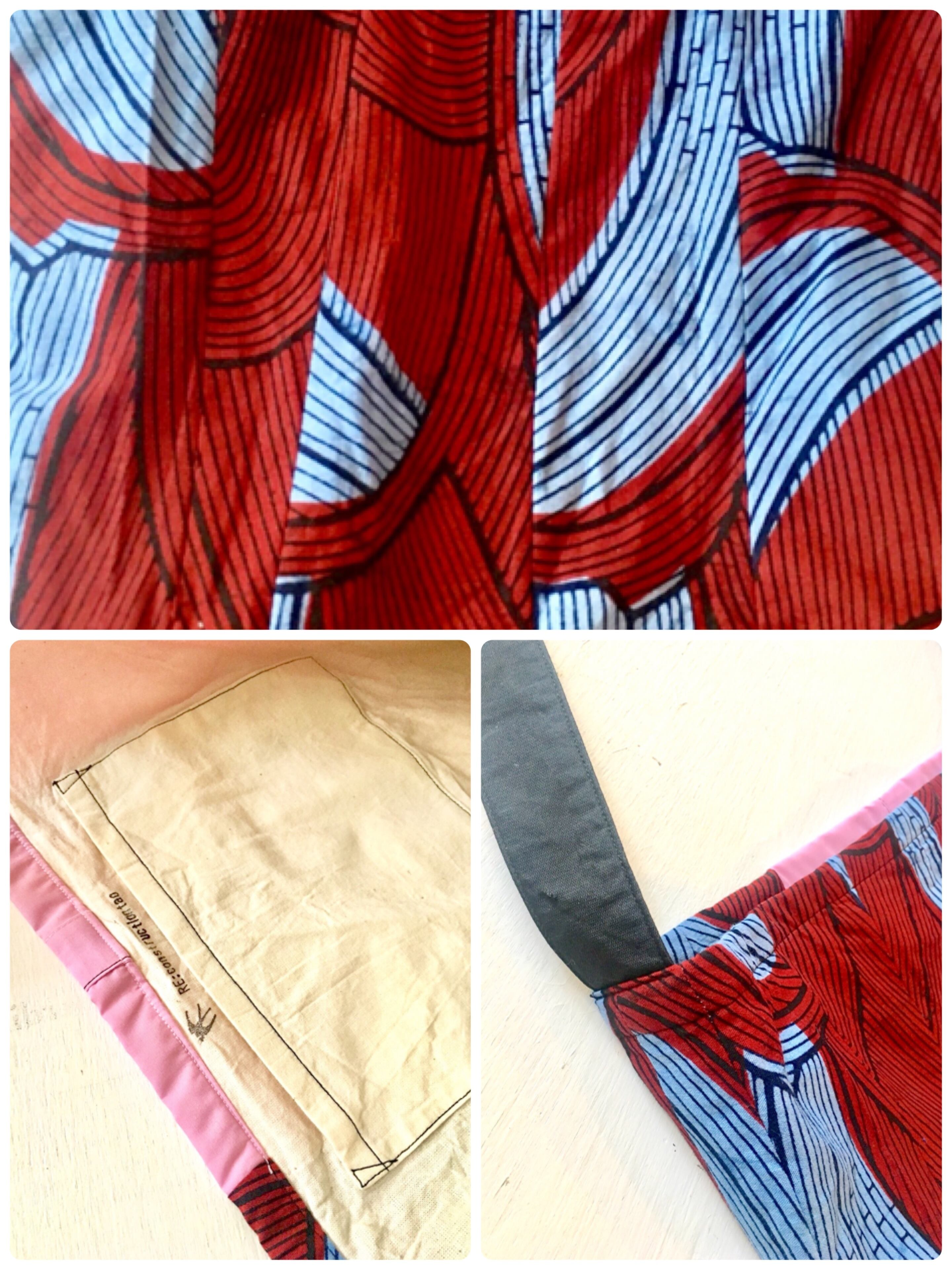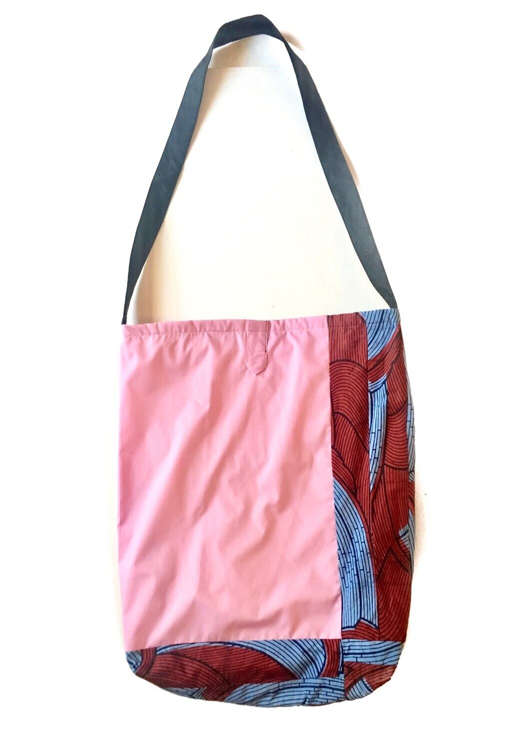 ベースとなるアフリカンバティック生地の鮮やかな色目と保護色にならないカラーのブロード生地は元々はブラウスの袖部分。その名残を残した軽いバッグ。接着芯を全く使用せず、且つ製品洗いを施しています。爽やかなデザイン。