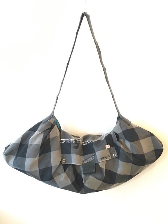 ブロックチェックが印象的なオーガンジーとナイロン生地の二枚仕立てのワンピースを解体し、作成したショルダーバッグ。