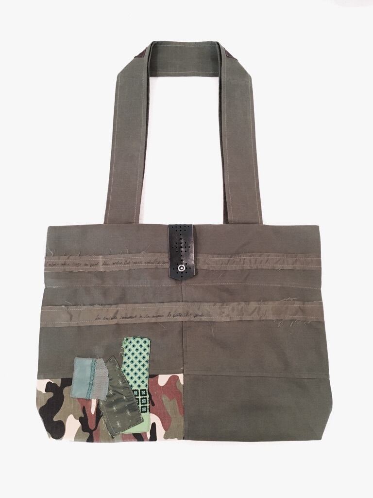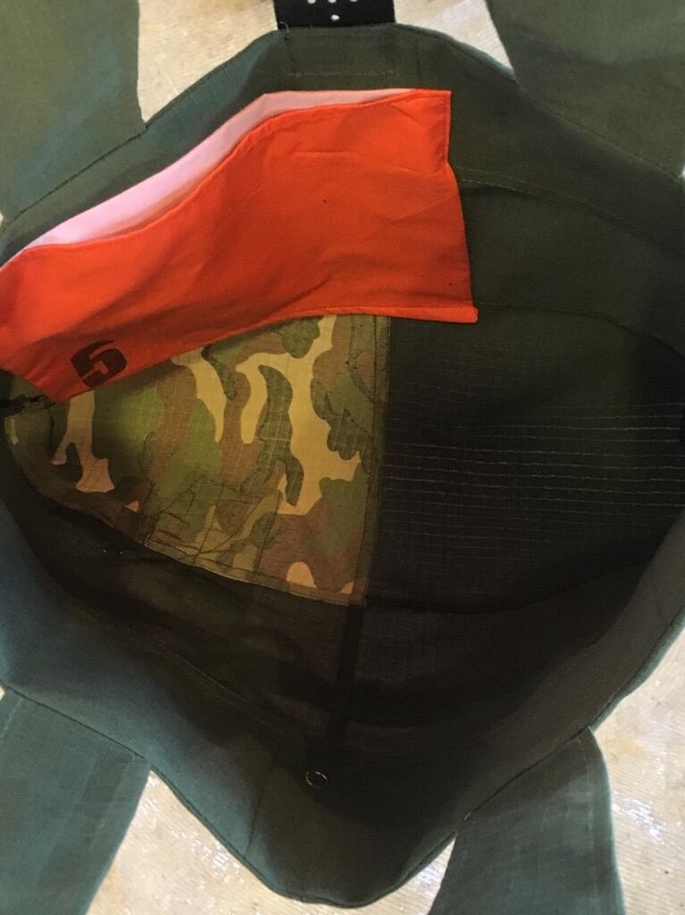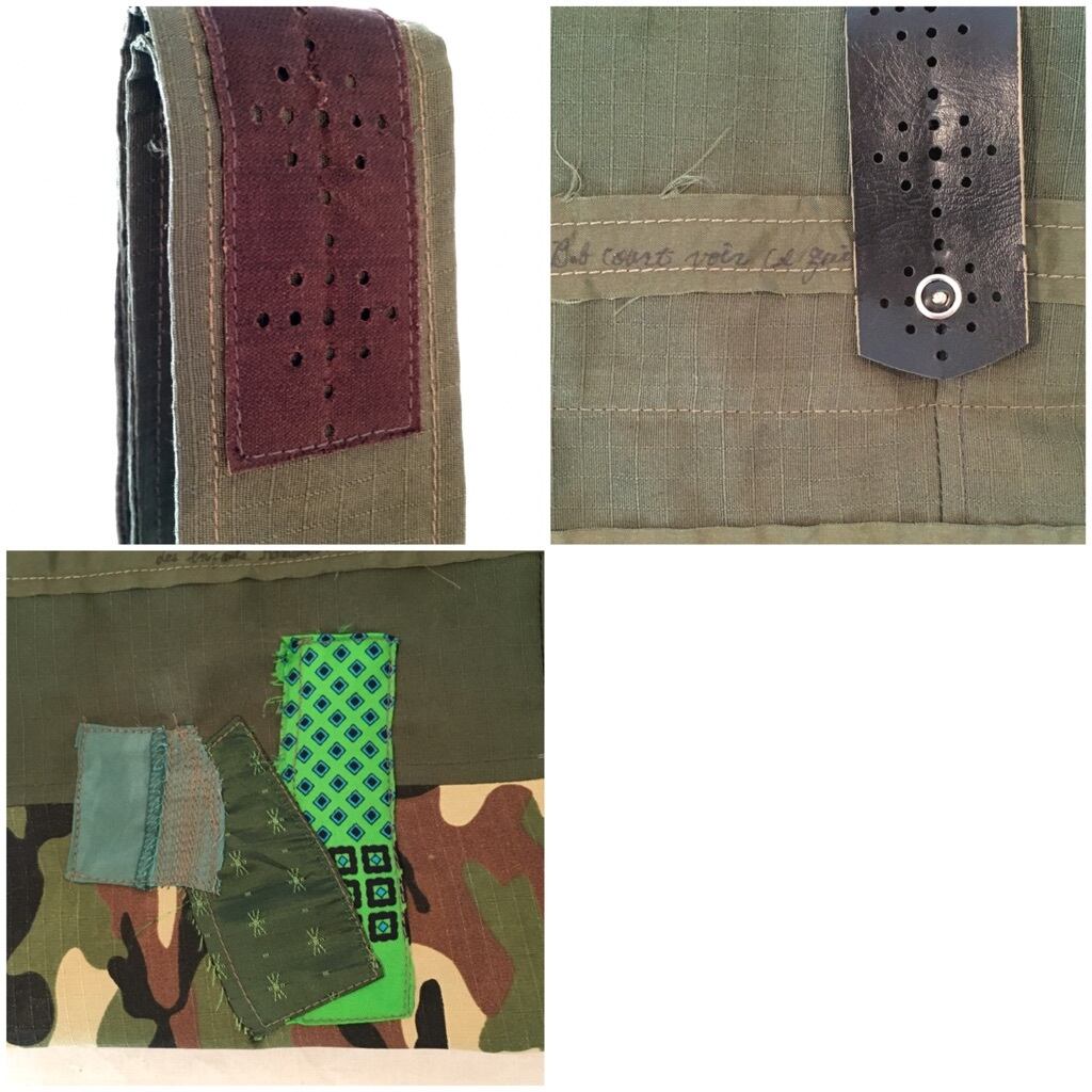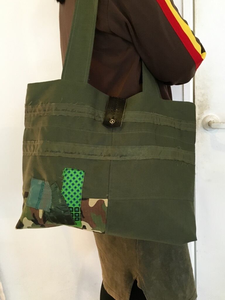 ヴィンテージファブリックを解体し、布状にしたものをパッチワークした点もポイント。カモフラ部分に合わせる事で可愛らしい印象にもなっています。