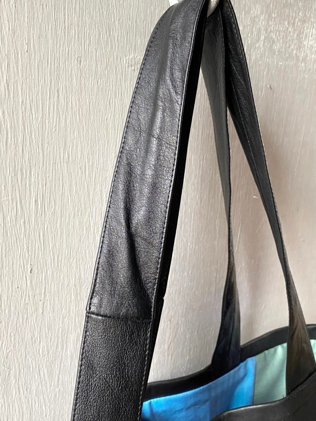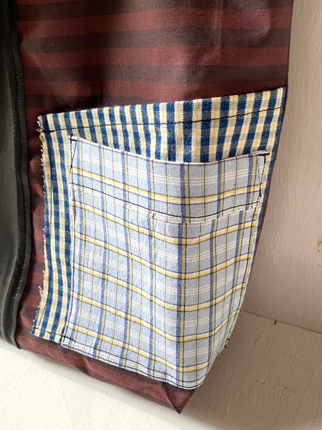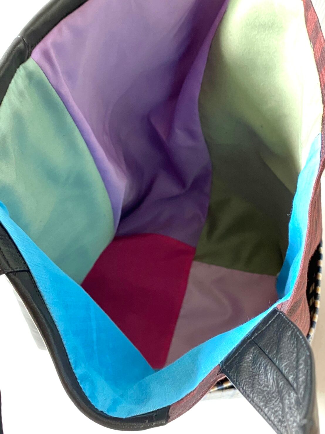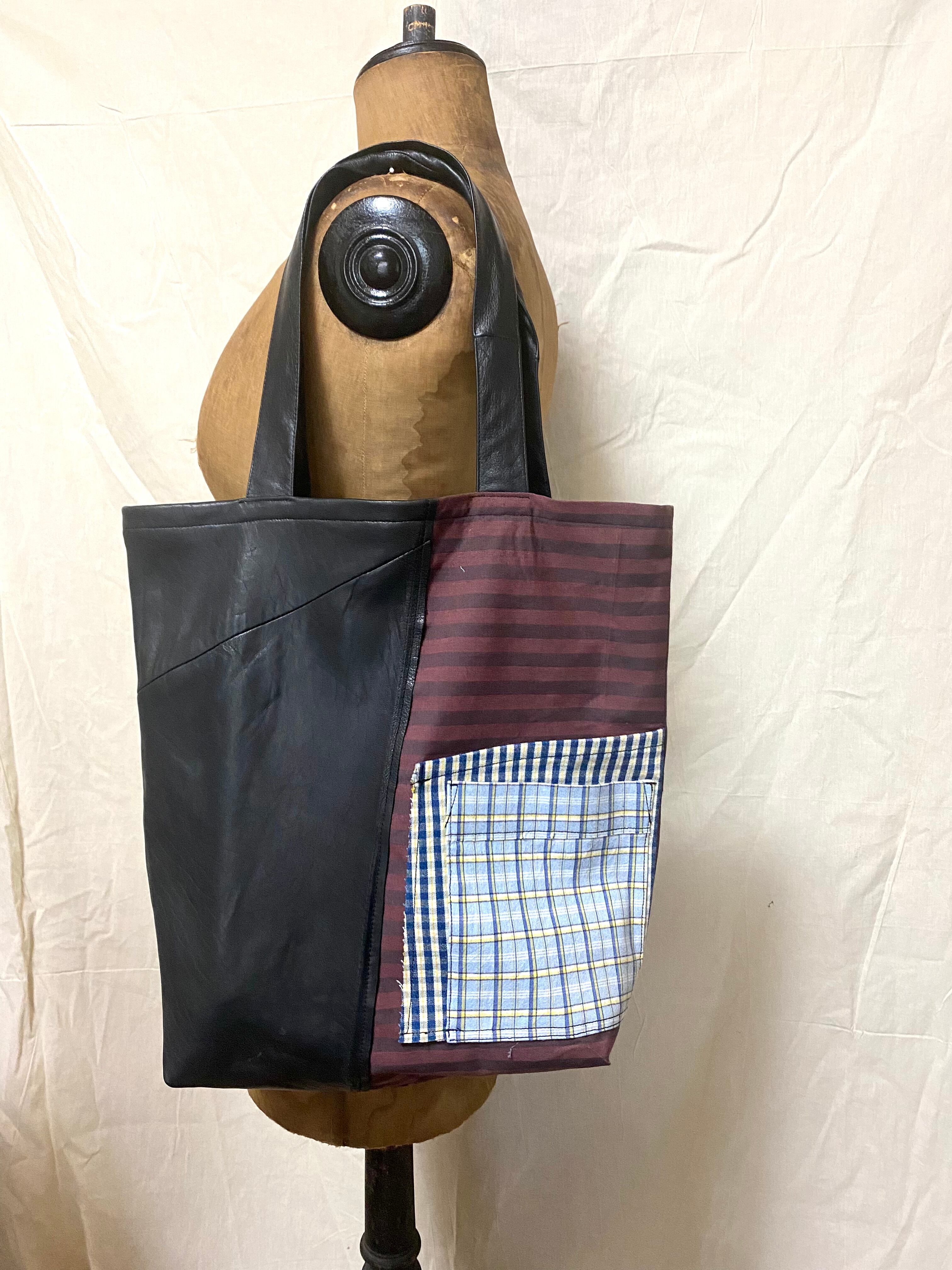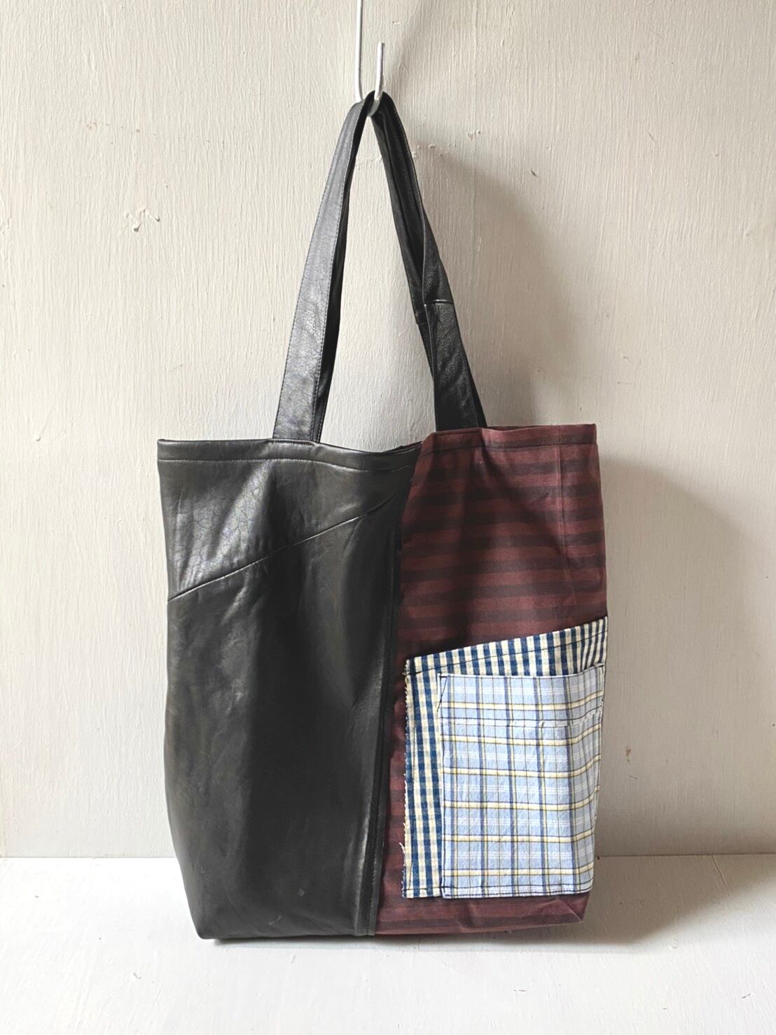 ヴィンテージの比較的薄手のレザーとボーダー、チェック柄など数種類パッチワークしたトートバッグです。