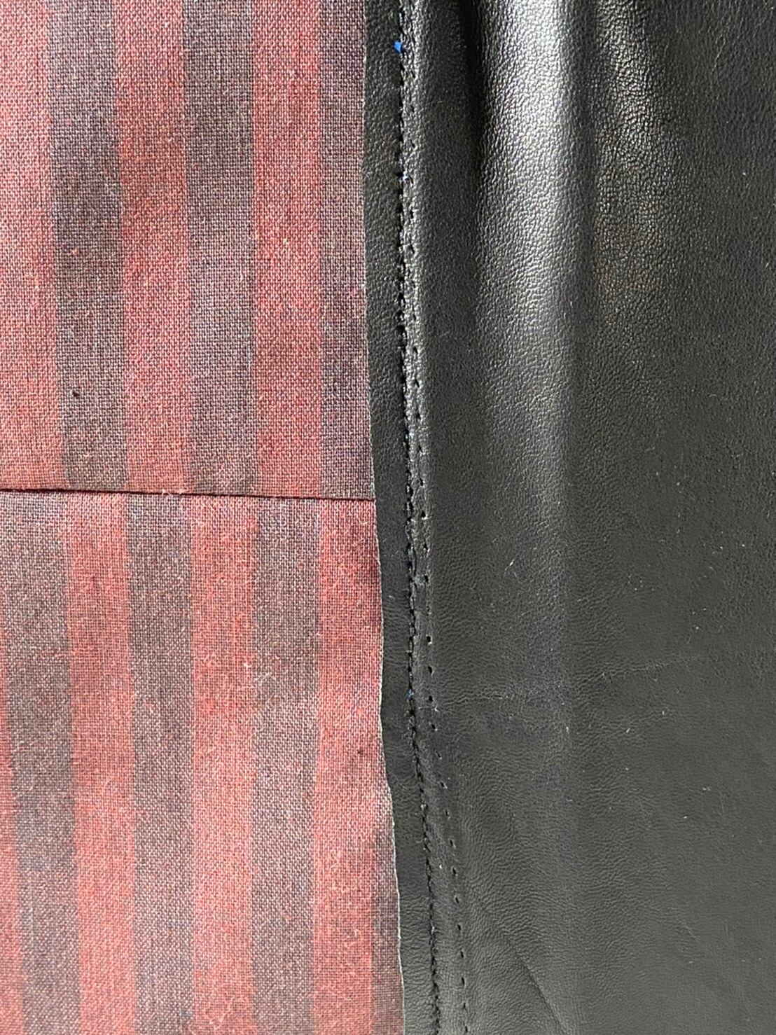 ベースとなるレザー生地はしっかりしてる割に軽量です。名残である元のシームの針穴もデザインの一部として取り込んでいます。