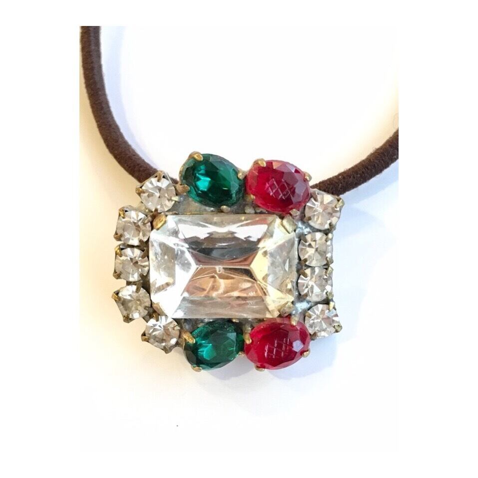 クリスマスカラーの赤と緑が印象的なガラスボタンです。大粒のクリアガラスと周りのラインストーンもその美しさを一層引き立てます。