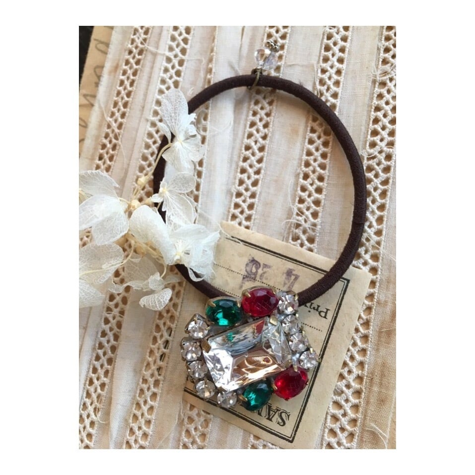 ヴィンテージチェコガラスボタンとチャームを使用したヘアゴム。
