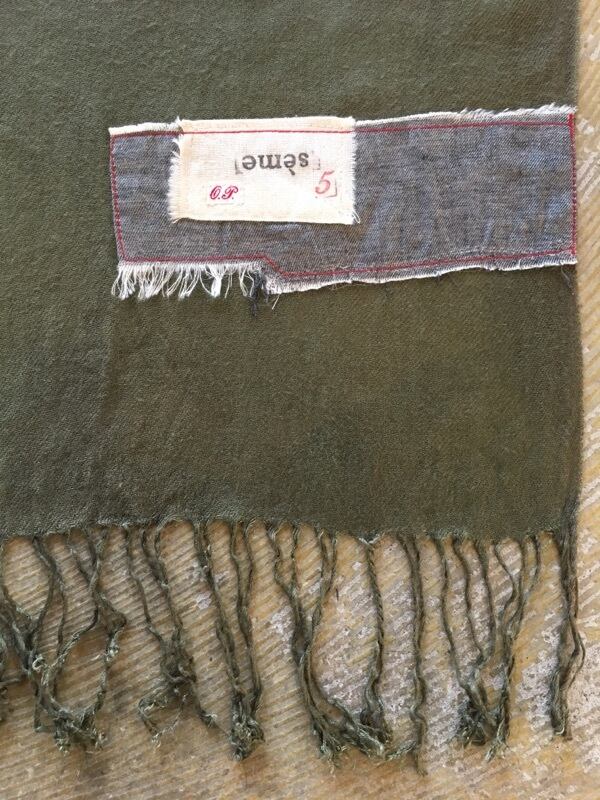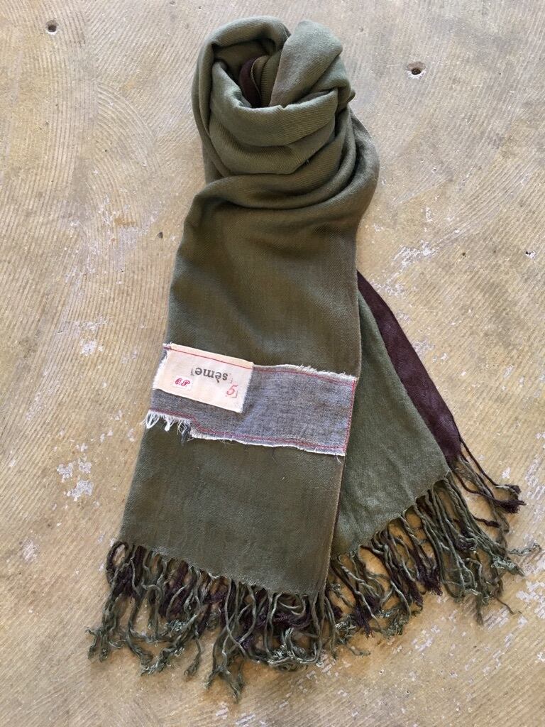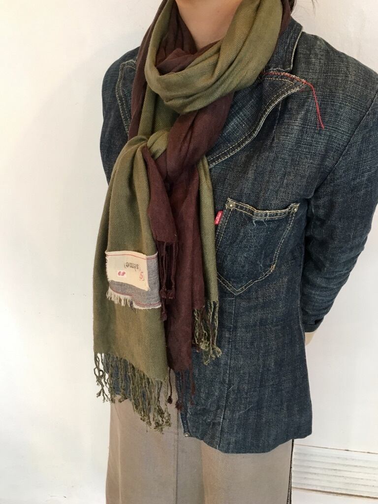 フランスにて集めた二枚のユーズドストールを縦方向で接ぎ合わせ巻いた状態でバイカラー(ブラウン×カーキ)になる仕様。