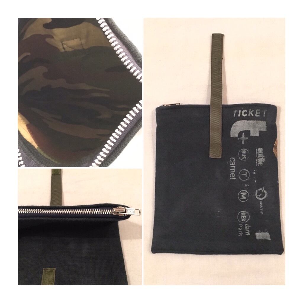 パリの地下鉄の切符のプリントをアクセントに加え、裏地には未使用のカモフラ生地を使用したのもポイントです。
