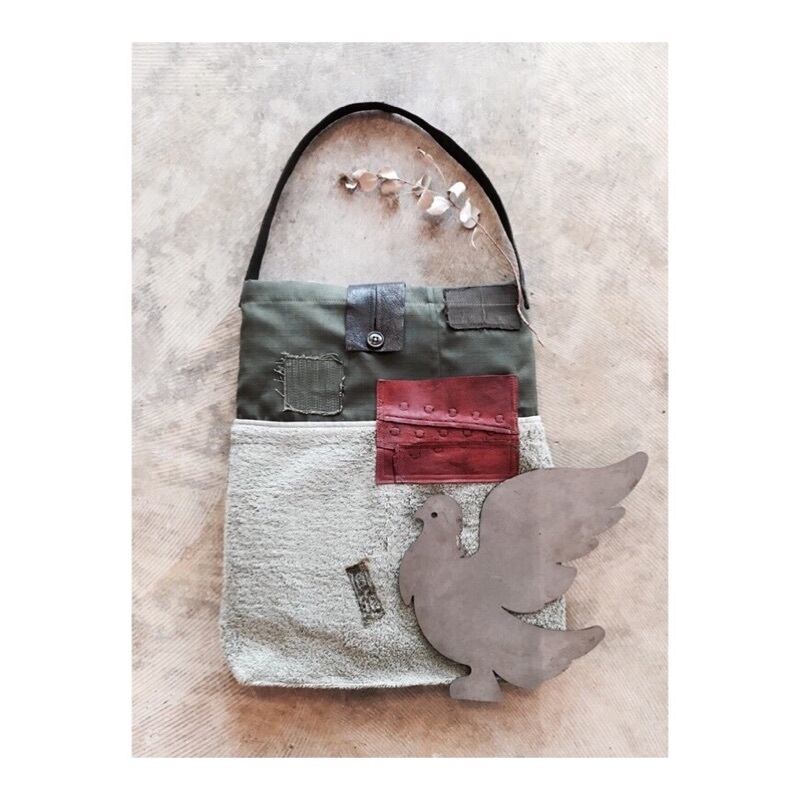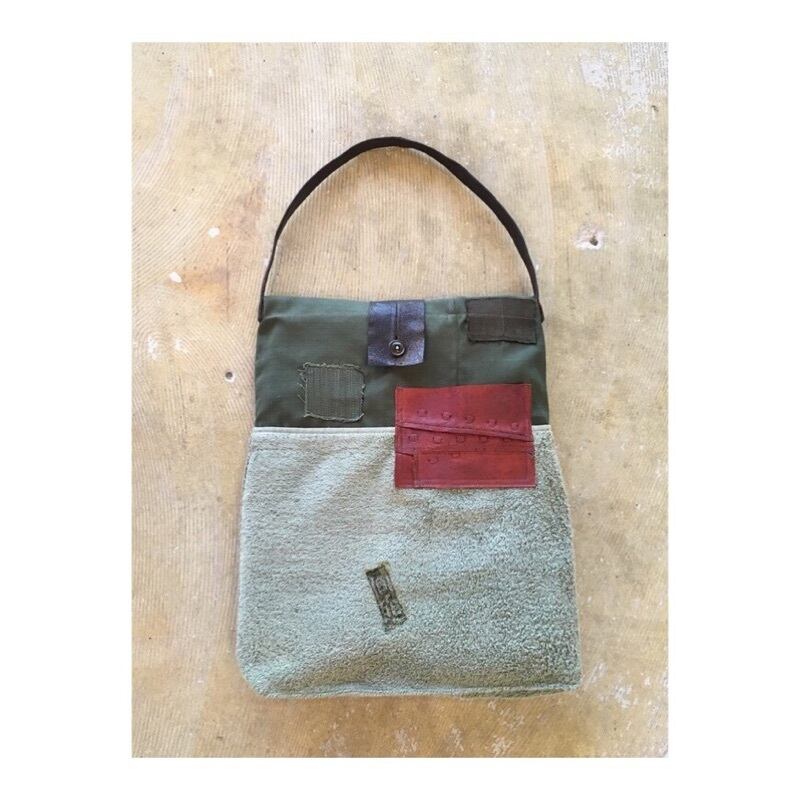 ミリタリーのファブリックを繫ぎ合わせたトートバッグ。
