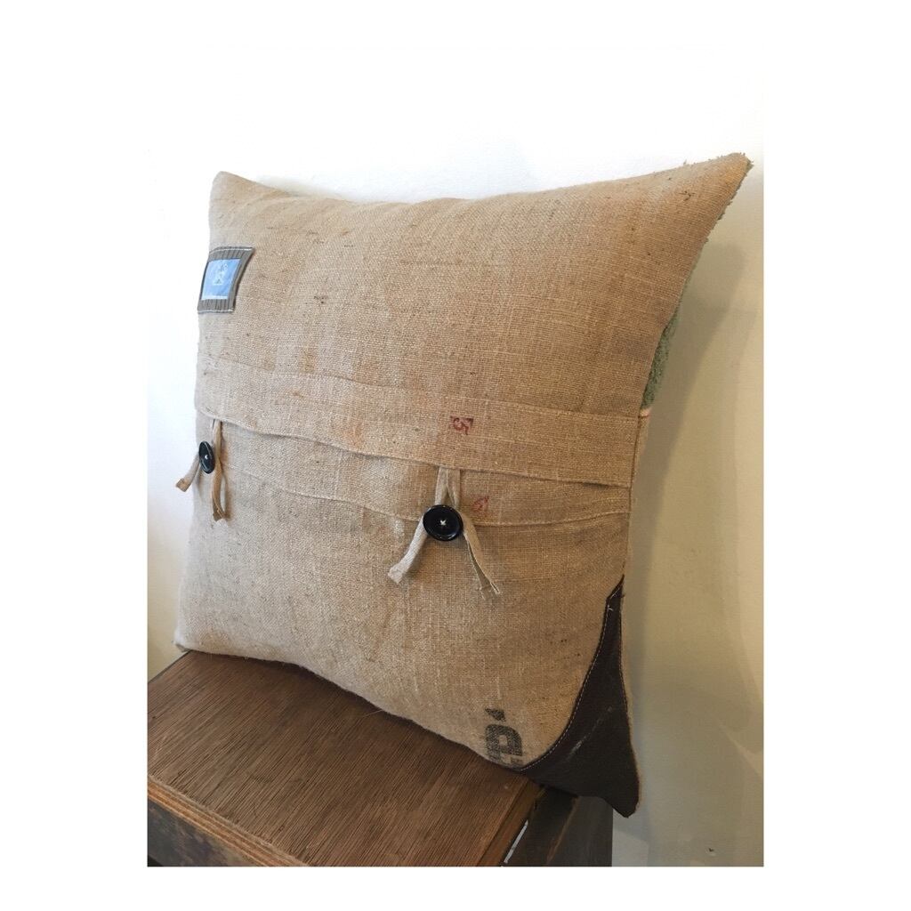 ヴィンテージリネンシーツをベースに、タオル地のファブリックやレザーなどを組み合わせ作成したクッション。