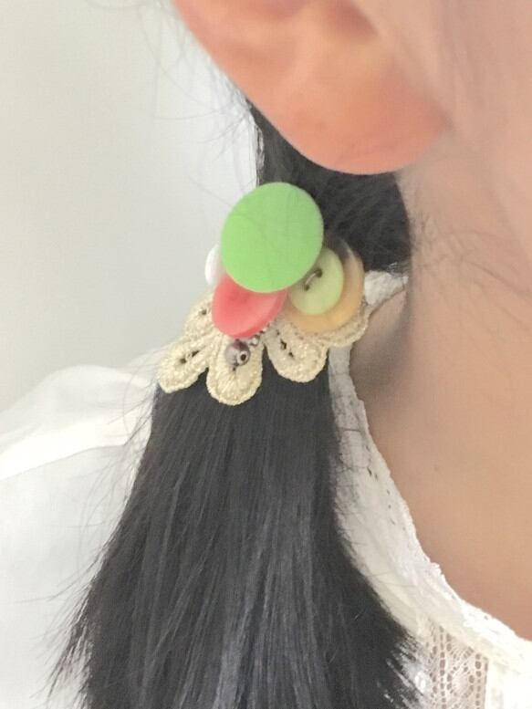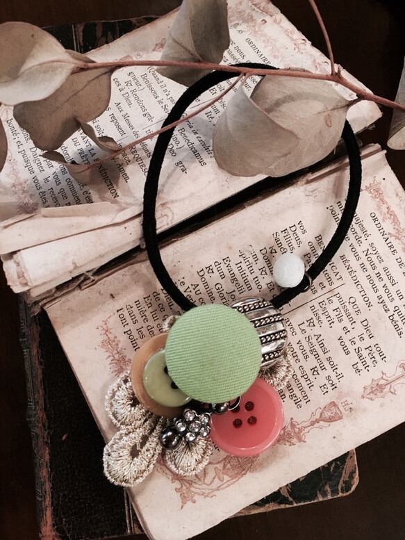 へアゴムです。フランスにて集めたヴィンテージボタンや、レース、パーツを使いユラユラ揺れる動きのあるヘアゴム。
