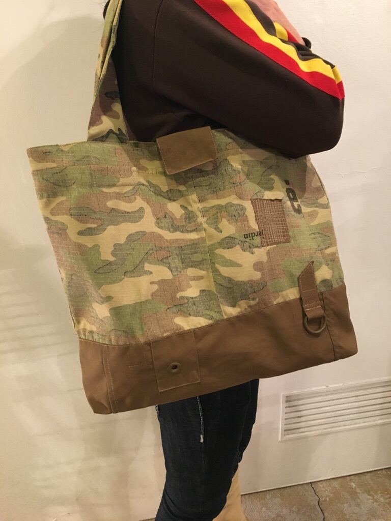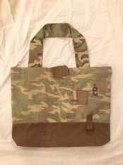 デットストックのカモフラ生地とヴィンテージミリタリーのバックパックを解体した生地で作成したトート。