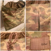 デットストックのカモフラ生地とヴィンテージミリタリーのバックパックを解体した生地で作成した巾着仕様のショルダーバッグ。
