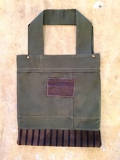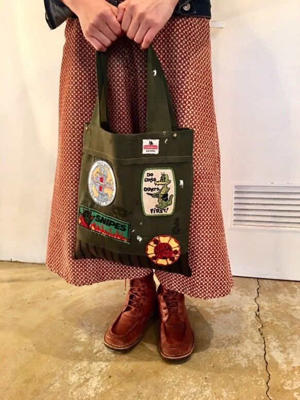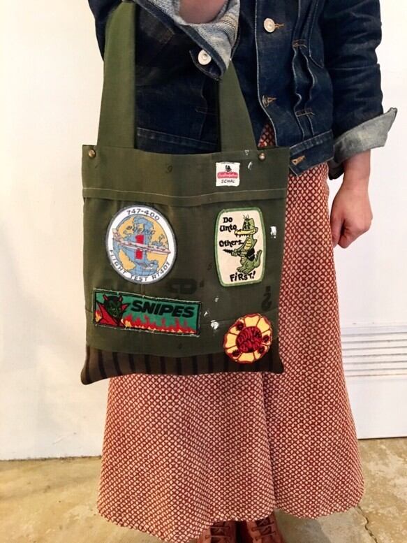 デッドストックのリップストップにヴィンテージウエア等から外したインパクトあるワッペンを付け作成したトートバッグ。