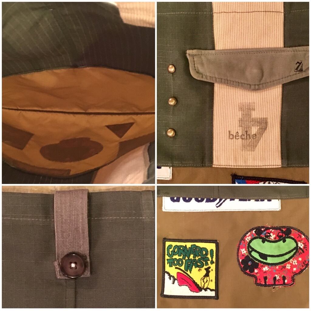 状態はヴィンテージアイテムを解体したファブリックで再構築されています部分につきましては経年のダメージはそれなりにあります。シミ、汚れ、針穴、ペイントなどもデザインの一部と捉えたお品になります。