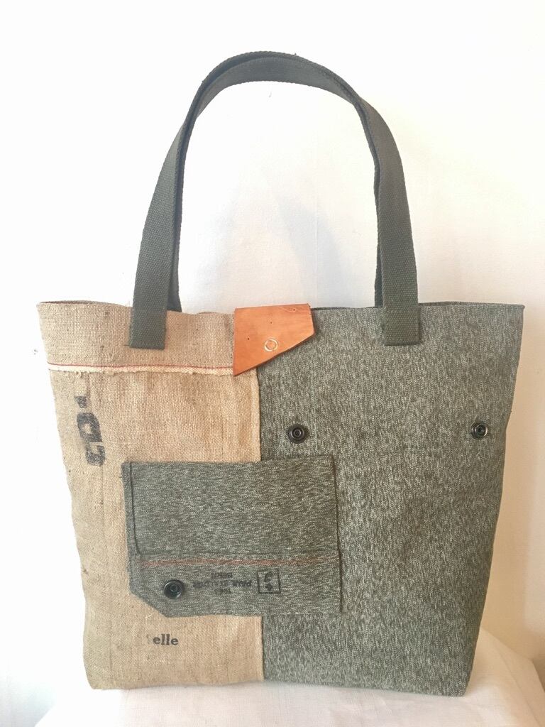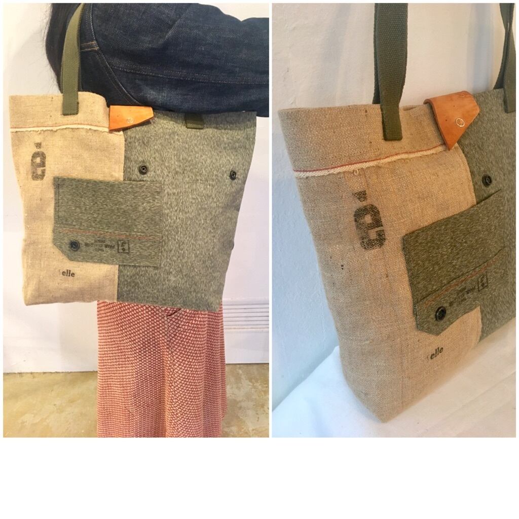 元々、円柱形でショルダーバッグ仕様のバッグでしたが、解体し、ヴィンテージリネンと合わせトートバッグに。