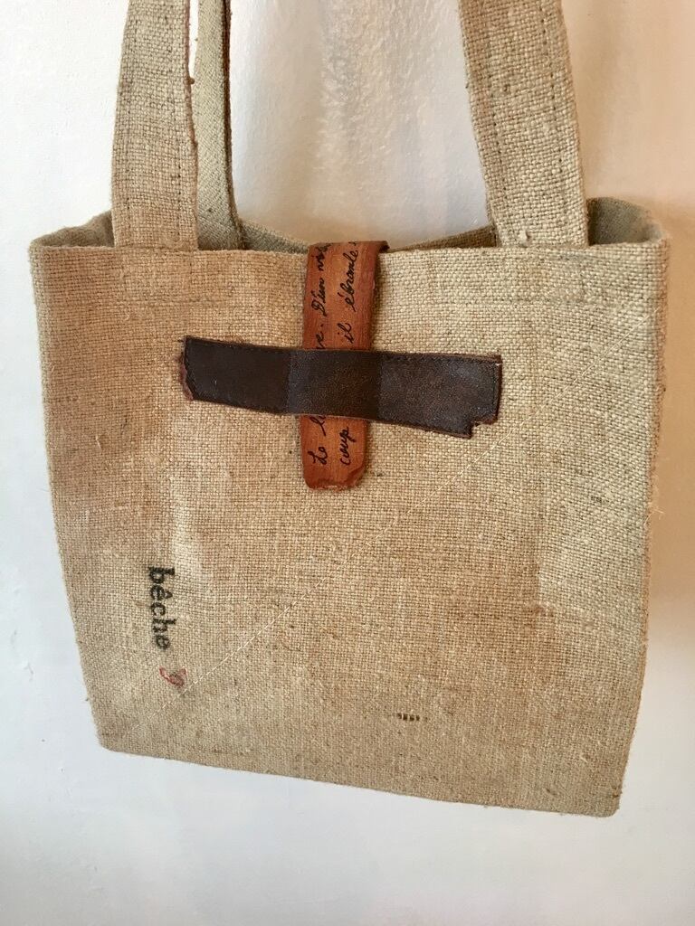 ヴィンテージのリネンシーツに厚めの芯を貼り、スクエアの形が出るようにした点がポイントです。