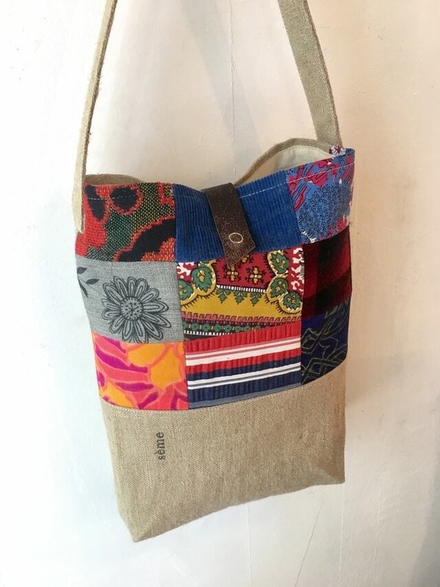 ナチュラルでシンプルな素材感のリネンと、それぞれの可愛らしさを持つファブリックのパッチワークを合わせたバッグ。