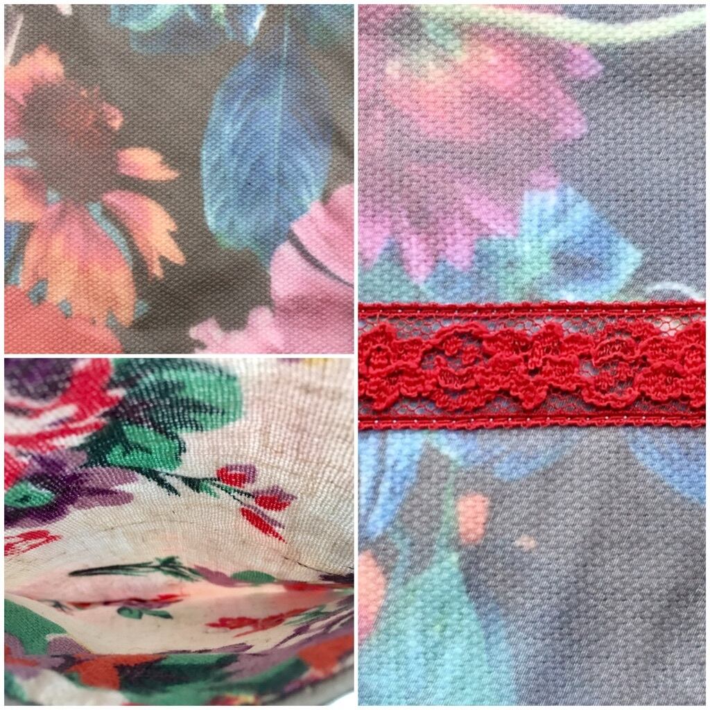 透明感ある花柄に鮮やかな赤のレースとレザーがとてもいいアクセントに。