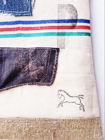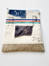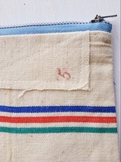フランスヴィンテージリネンシーツとコットンクロスをベースに作成した台形型ポーチ。