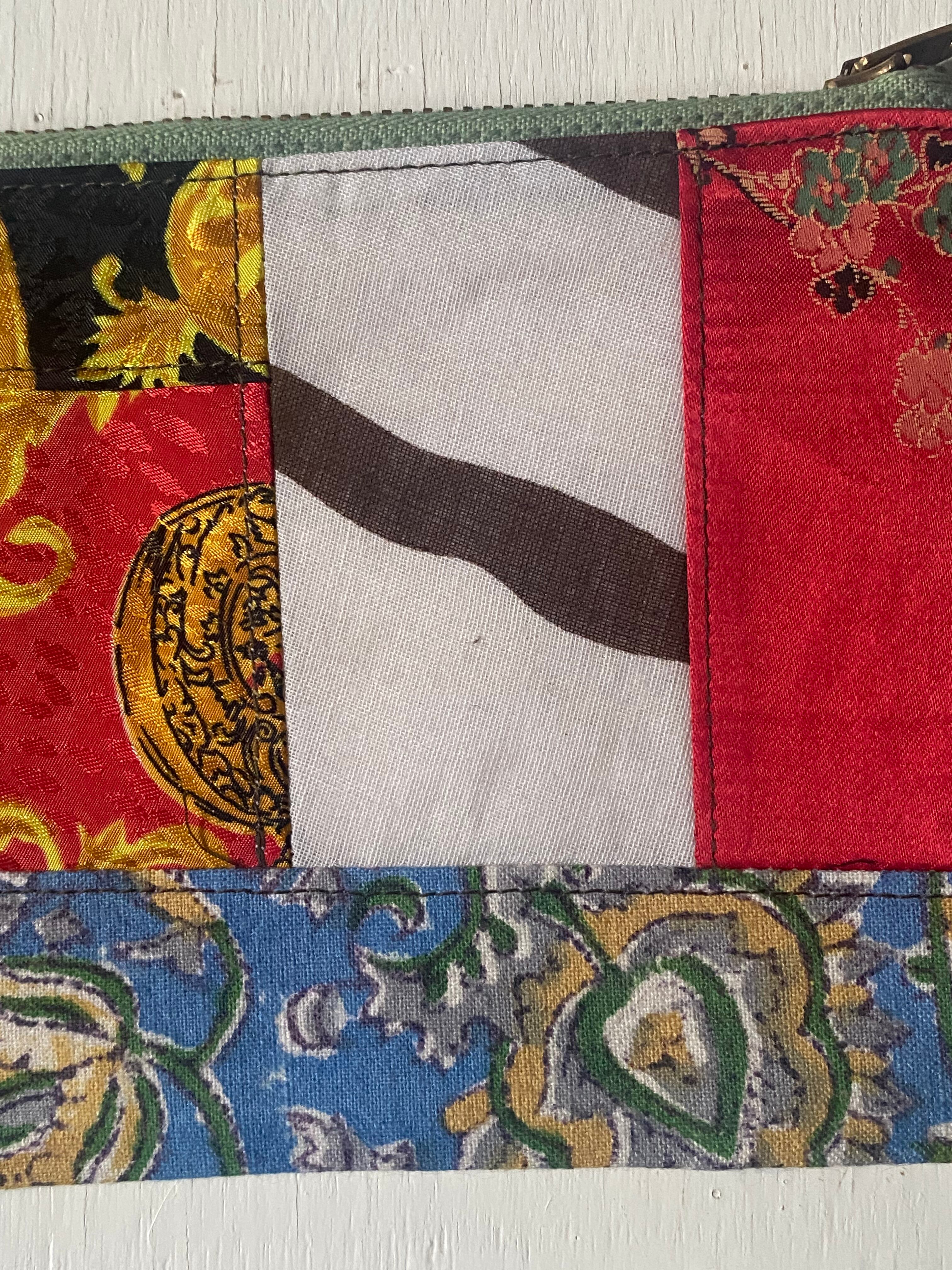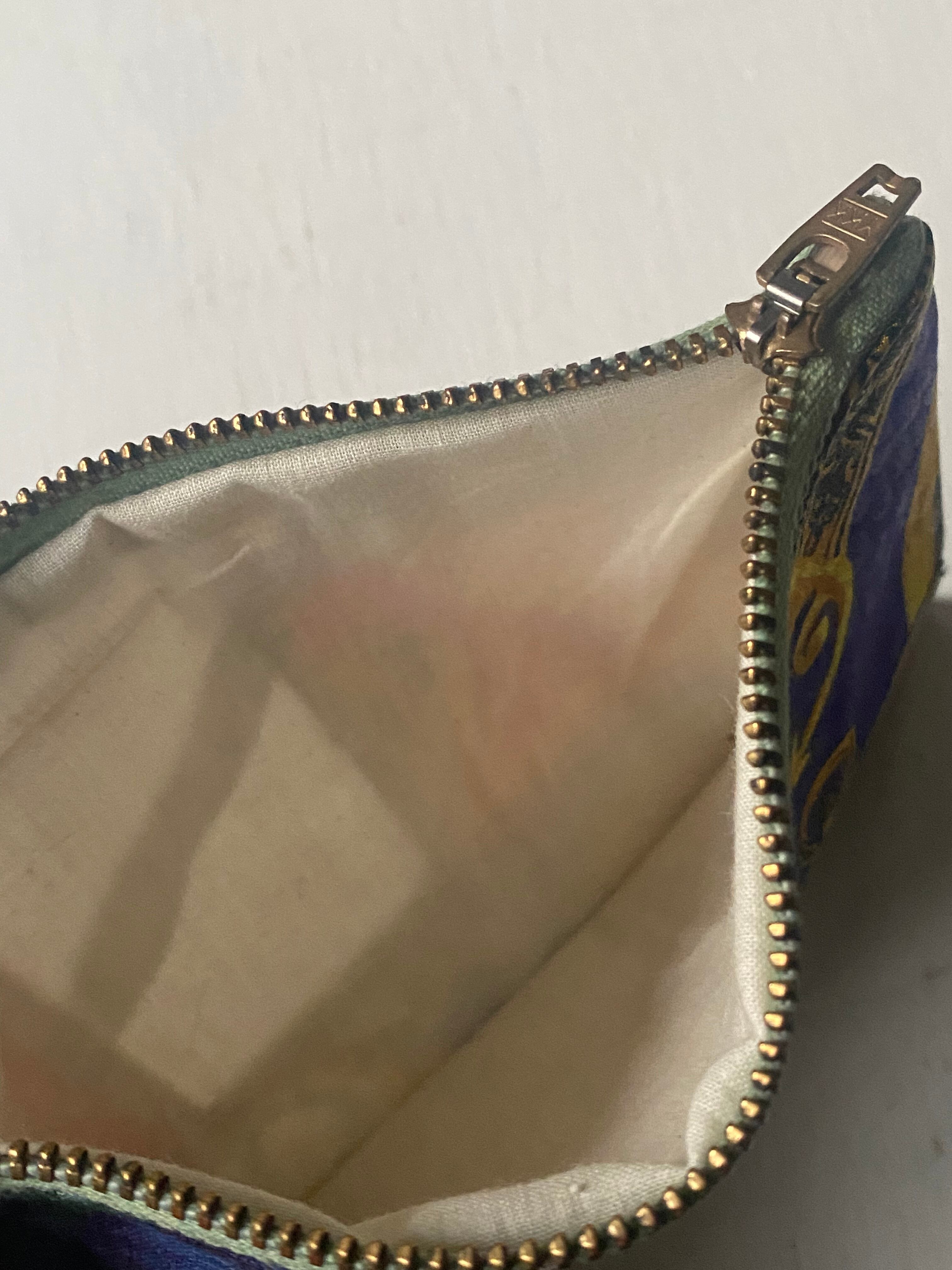 ヴィンテージのおもしろいテキスタイルをランダムに組み合わせたポーチ。