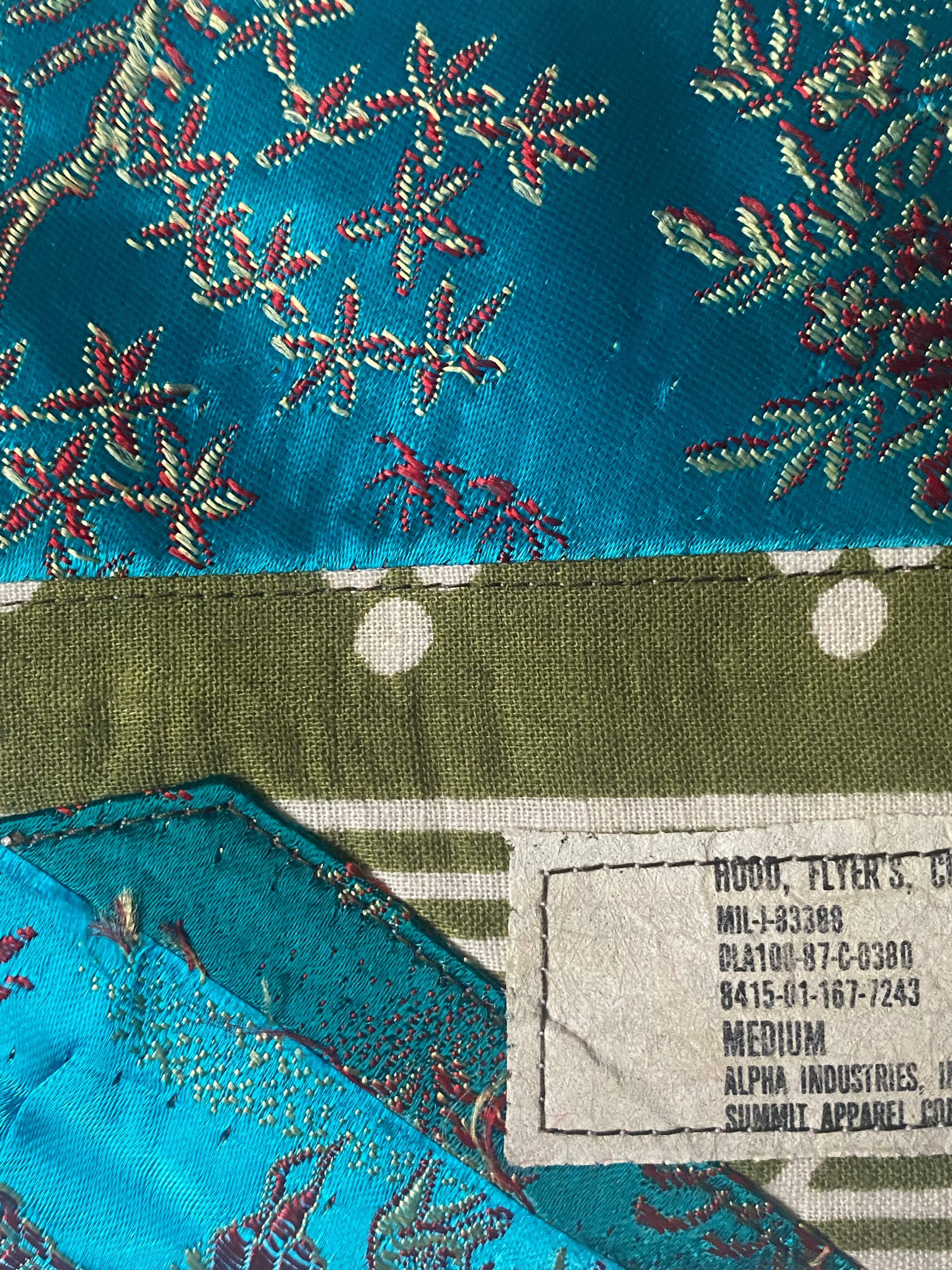状態はヴィンテージアイテムを解体したファブリックで再構築されています部分につきましては経年のダメージはそれなりにあります。アタリ、シミ、汚れ、針穴などもデザインの一部と捉えたお品になります。