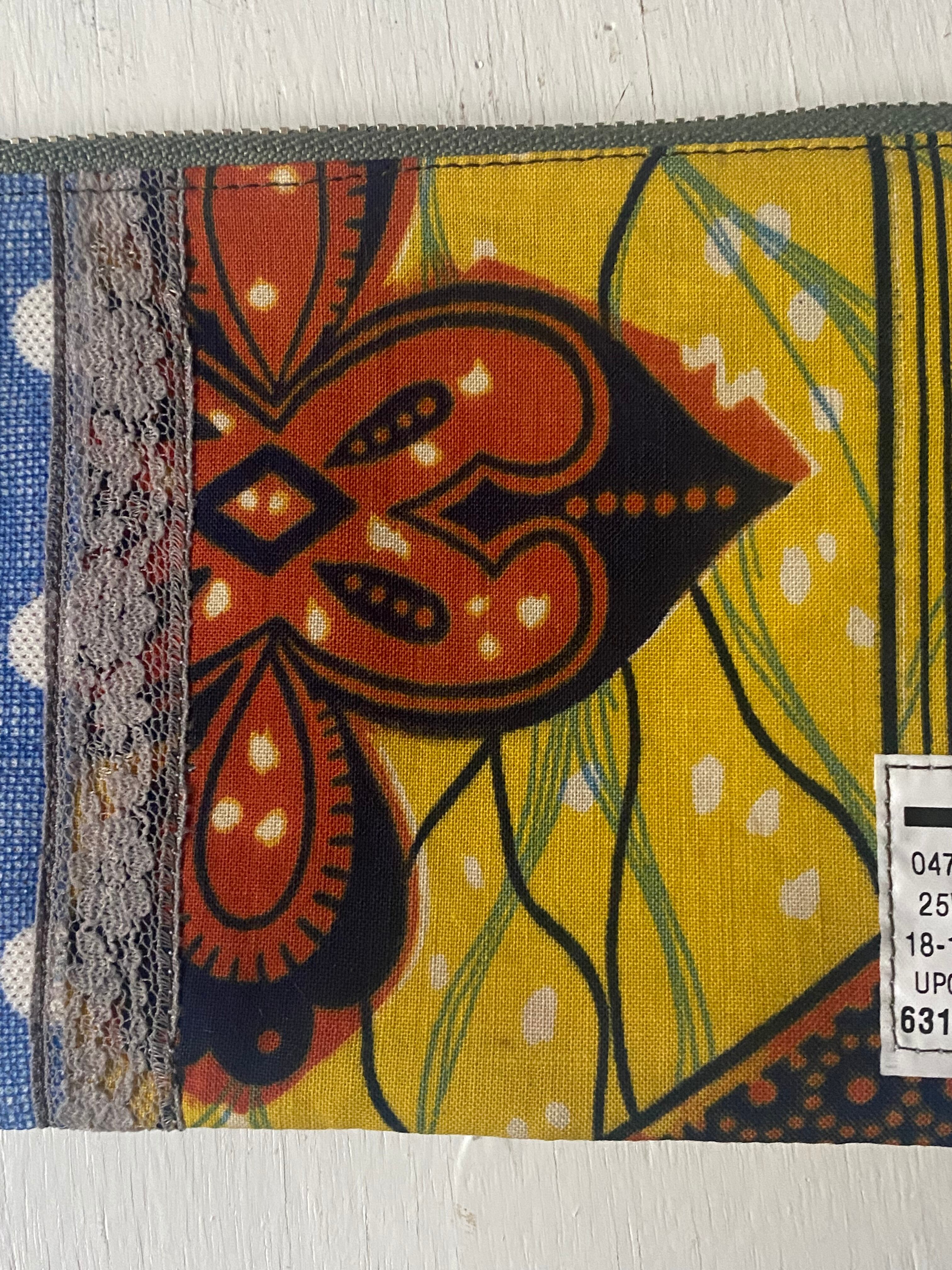 ヴィンテージのおもしろいテキスタイルをランダムに組み合わせたポーチ。