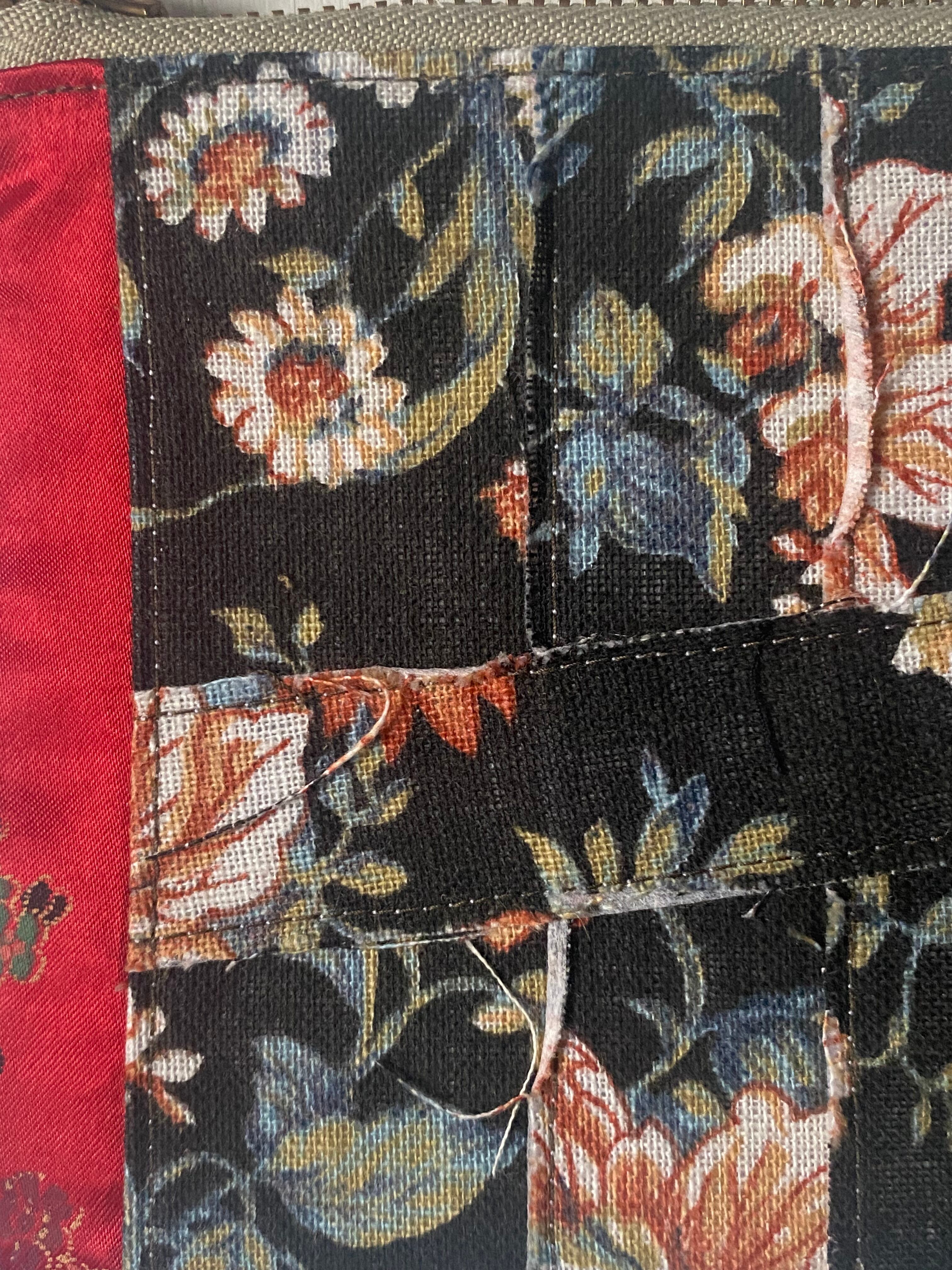 ヴィンテージのおもしろいテキスタイルをランダムに組み合わせたポーチ。