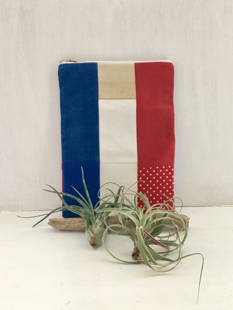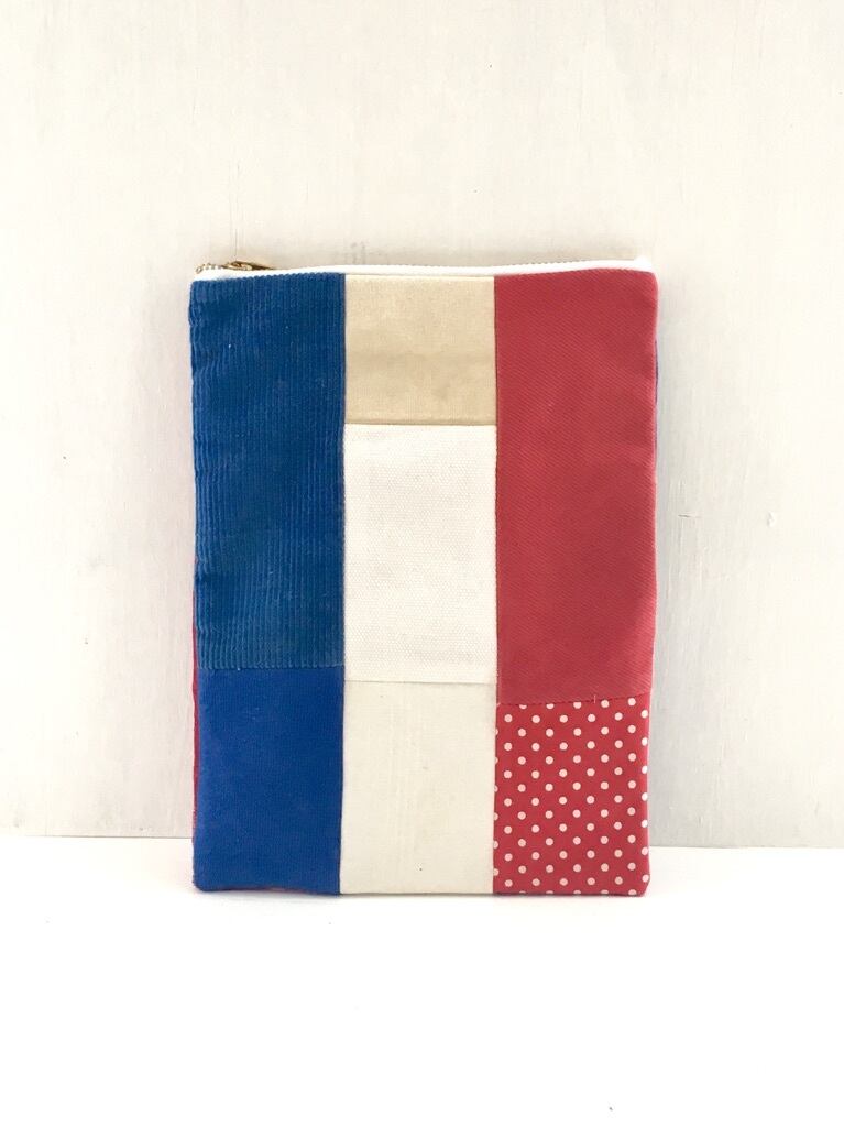 素材感の異なる生地をトリコルールカラーに合わせ、パッチワークしました。
