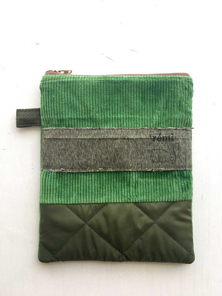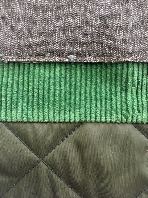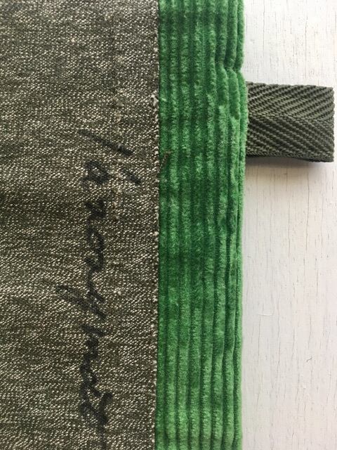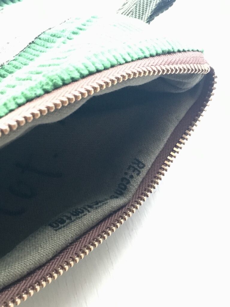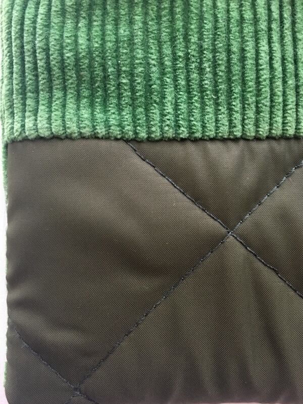 緑色の鮮やかなコーデュロイに同系色のヴィンテージミリタリーバッグを解体した生地を合わせました。