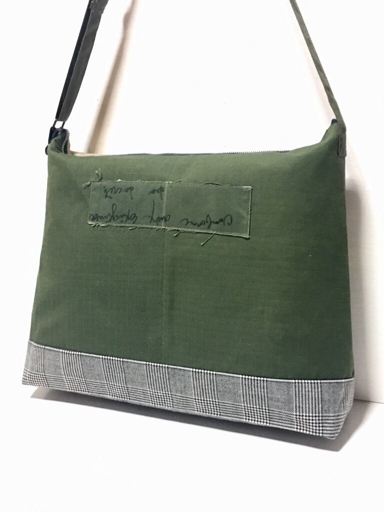 ヴィンテージミリタリージャケットなど数種類を解体、ファブリック状にし、パッチワークしたショルダーバッグ。