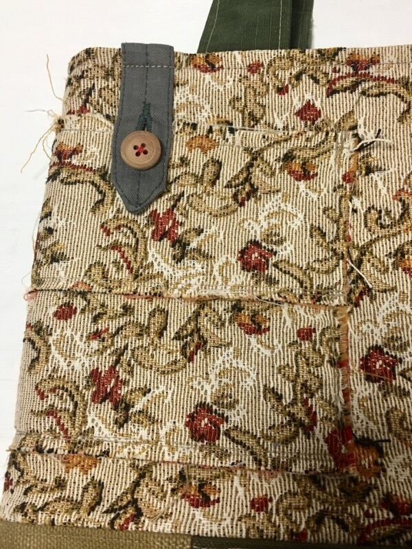 雰囲気の良いゴブラン織りとヴィンテージミリタリーアイテムのパッチワークトートバッグ。