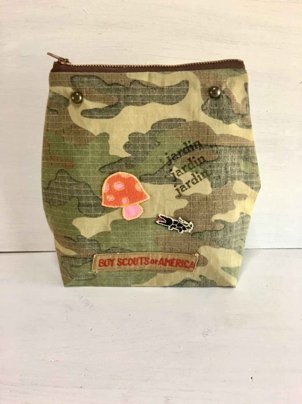 ヴィンテージのカモフラージュ柄をベースに同じくヴィンテージのワッペンを貼付け作成したポーチ。