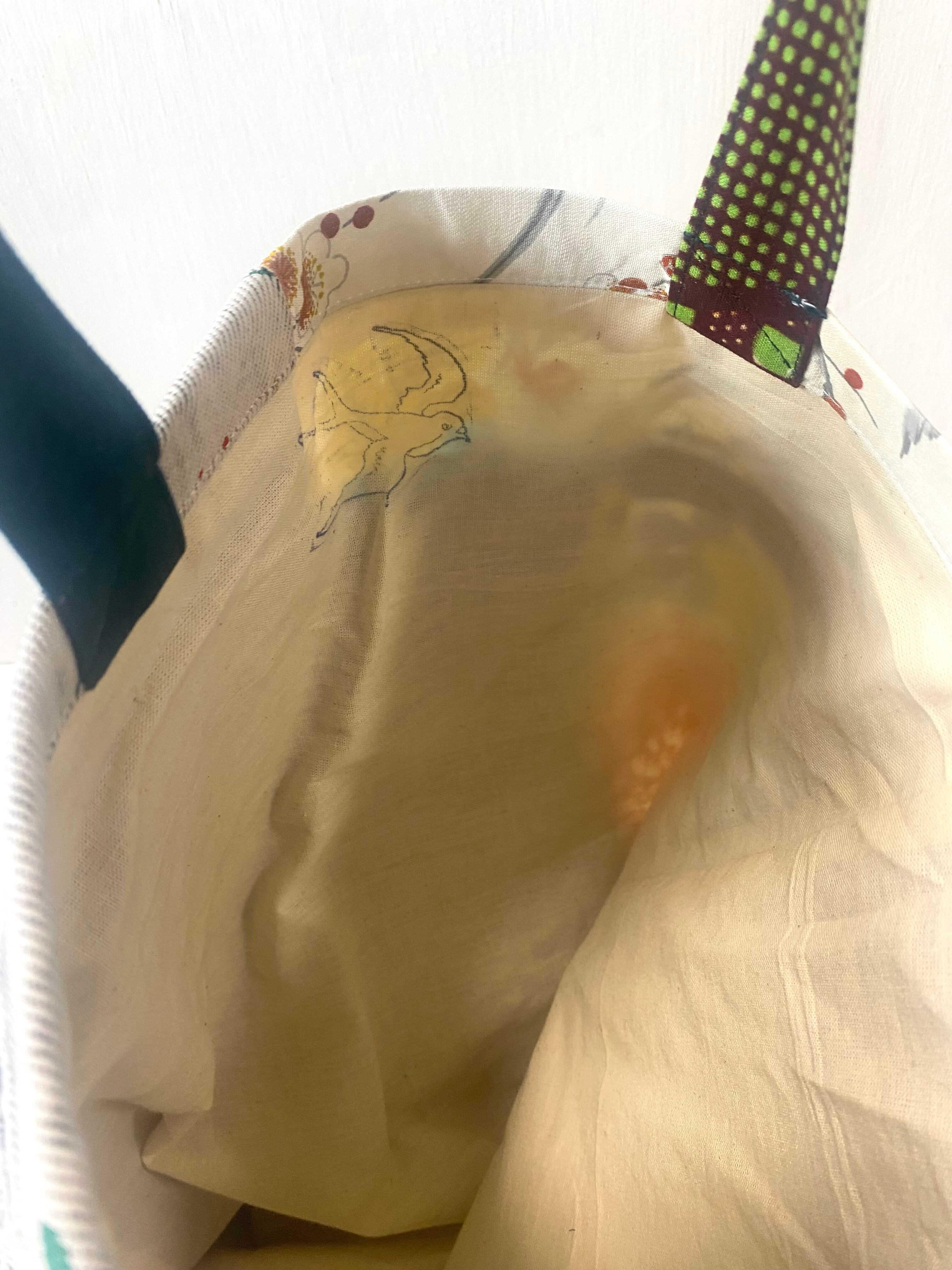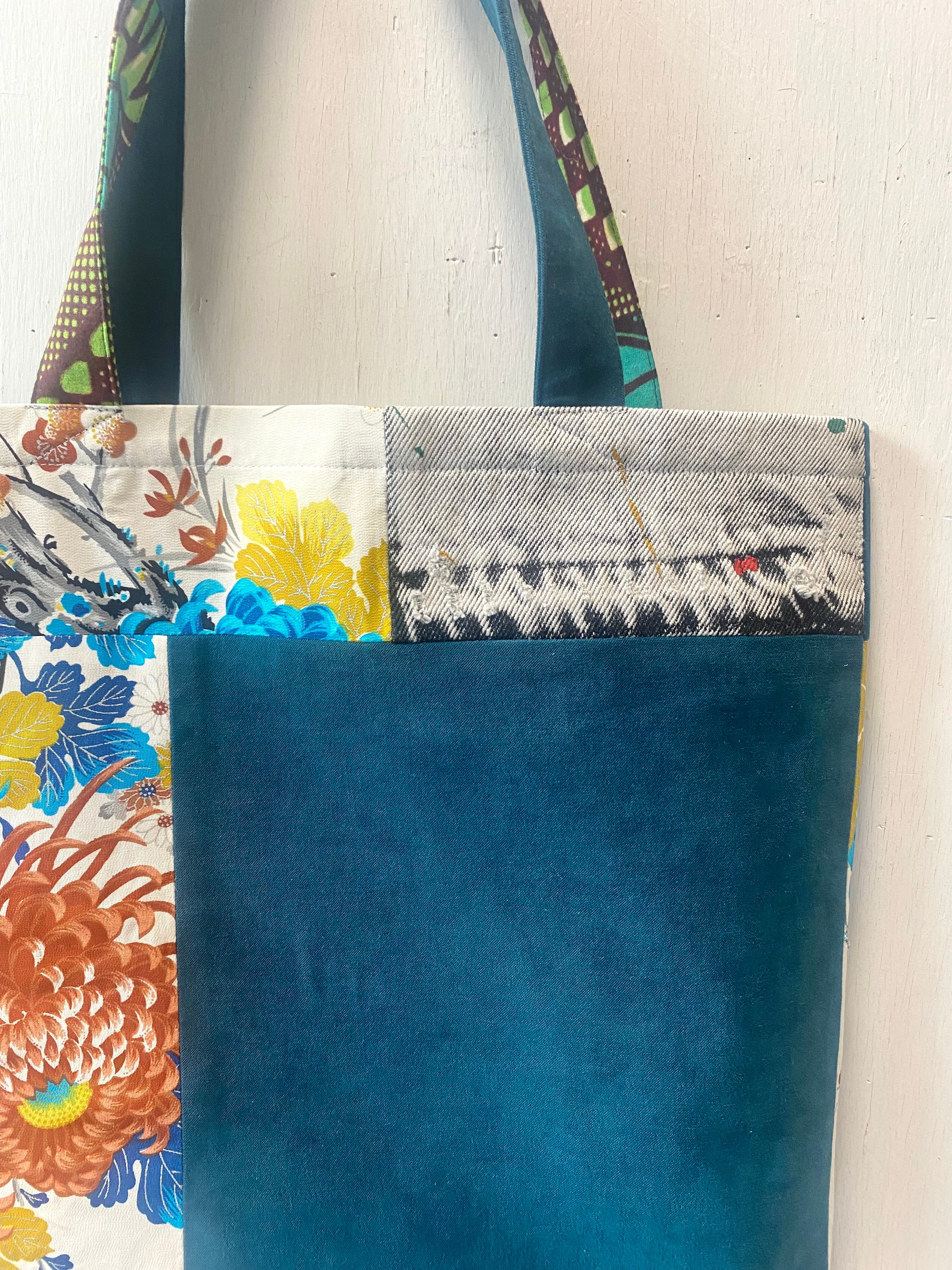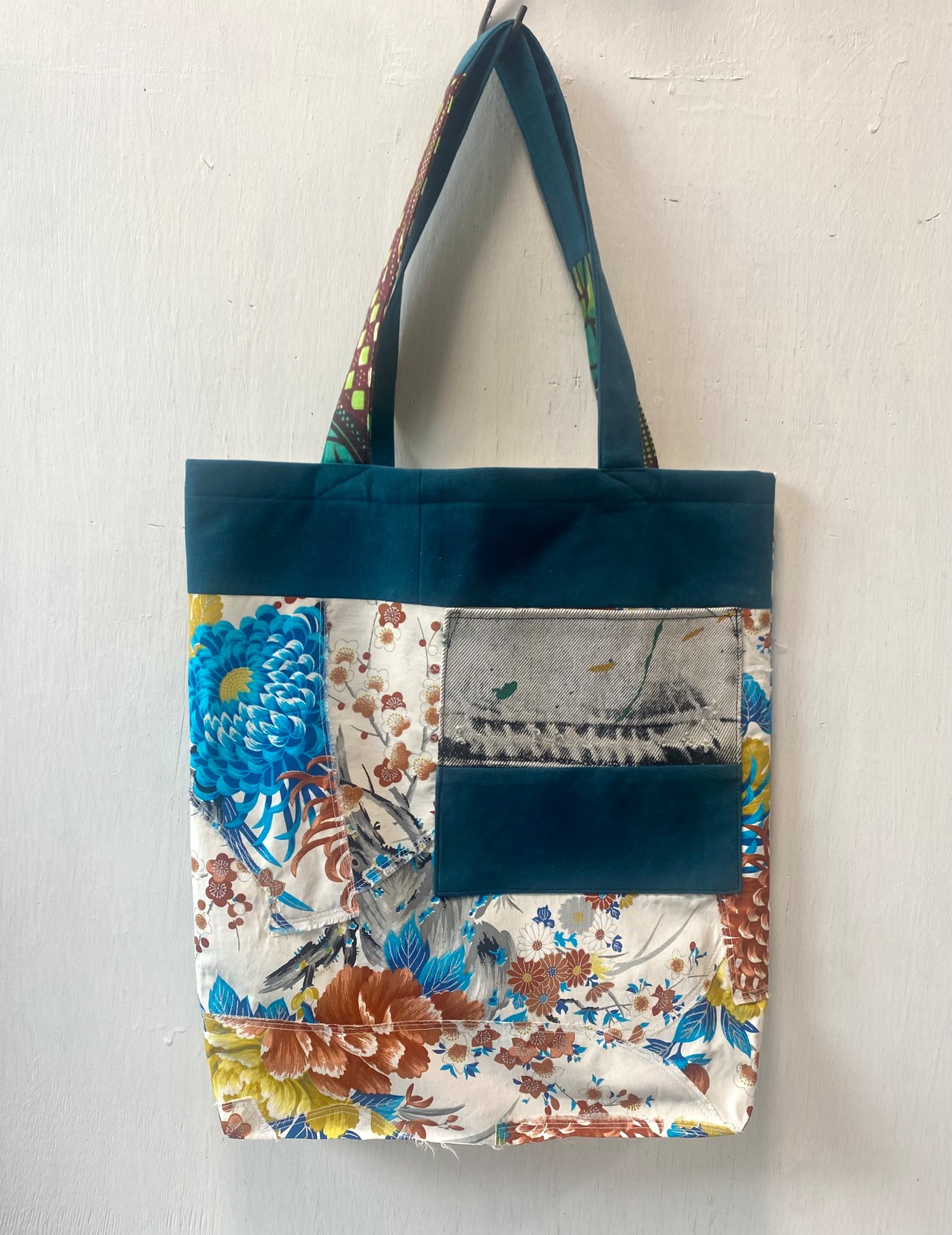 ヴィンテージの花柄をランダムに組み合わせたトートバッグ。薄手のシルク調で着物のような生地です。