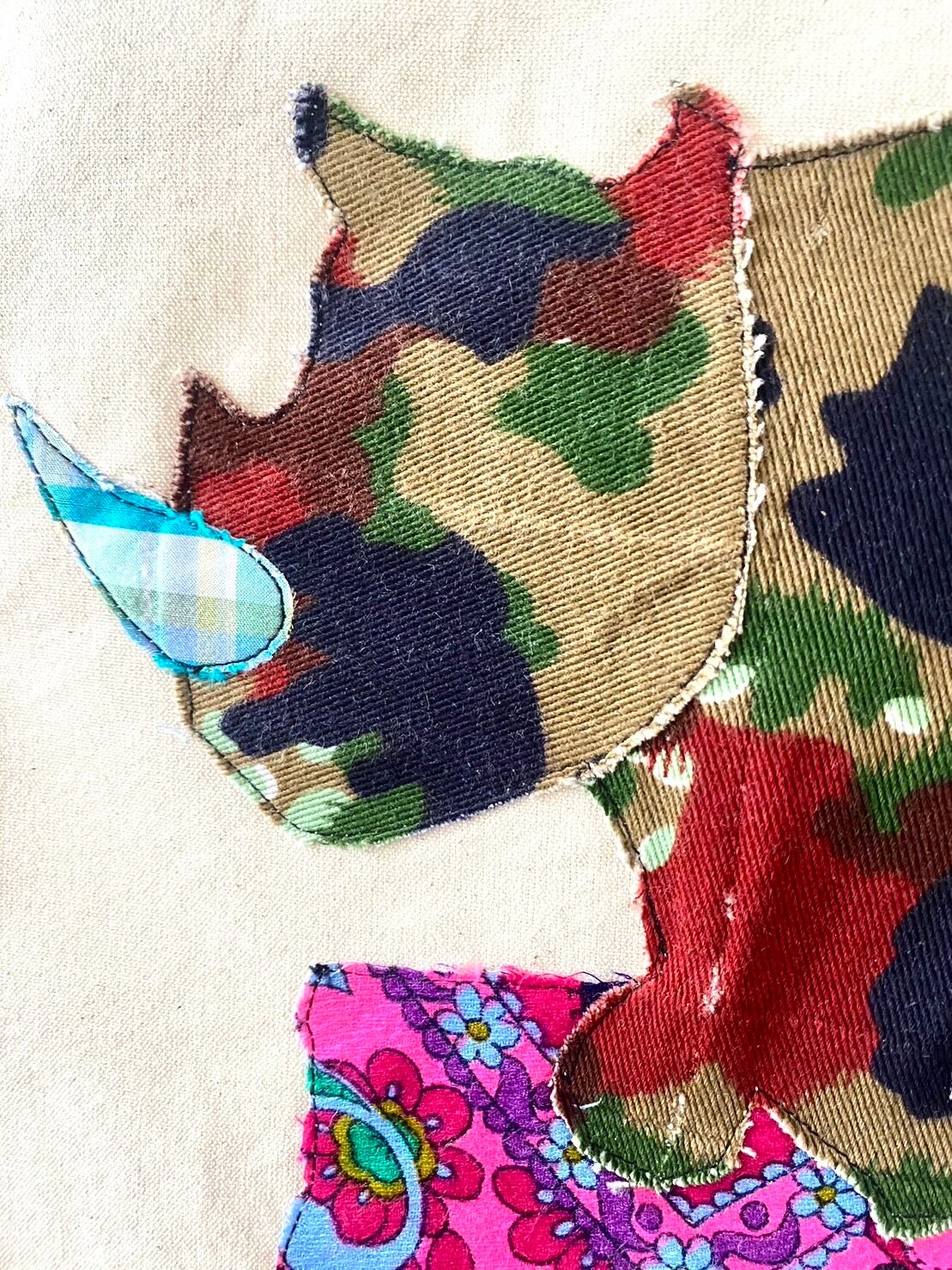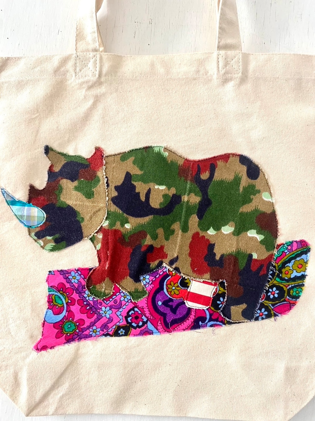 既成の生成りのトートにヴィンテージの様々なファブリックを組み合わせた動物シリーズのトートバッグ。