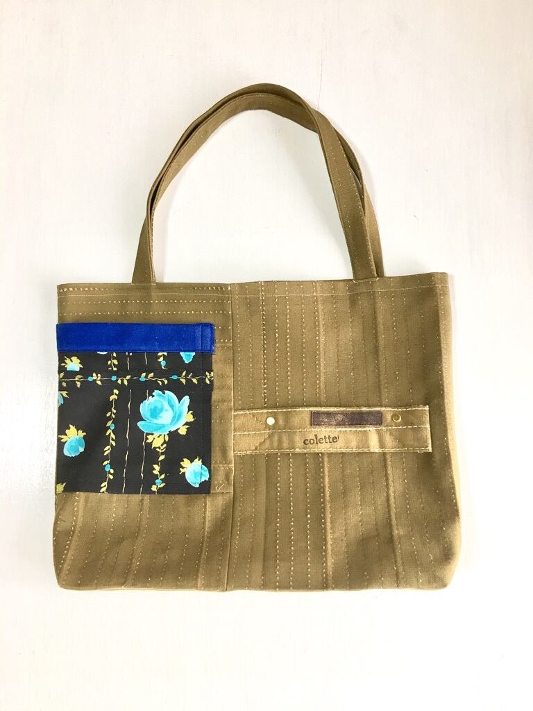 ヴィンテージのミリタリー荷造り用の紐を解体、ファブリック状にしたものを切り替えし、作成したトートバッグです。